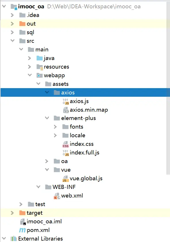 后端工程师推荐使用CDN方式进行安装,详细请查询官方文档 Element Plus依托于Vue组件,所以需要导入Vue插件 在webapp目录下新建assets文件夹,里面存放css、js、html等前端代码进行统一管理