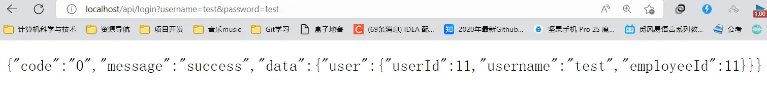 .put("nodeList", treeList).put("employee",employee).toJsonString();这样当前登陆员工获取到了 验证一下localhost/api/user_info?uid=1&eid=1