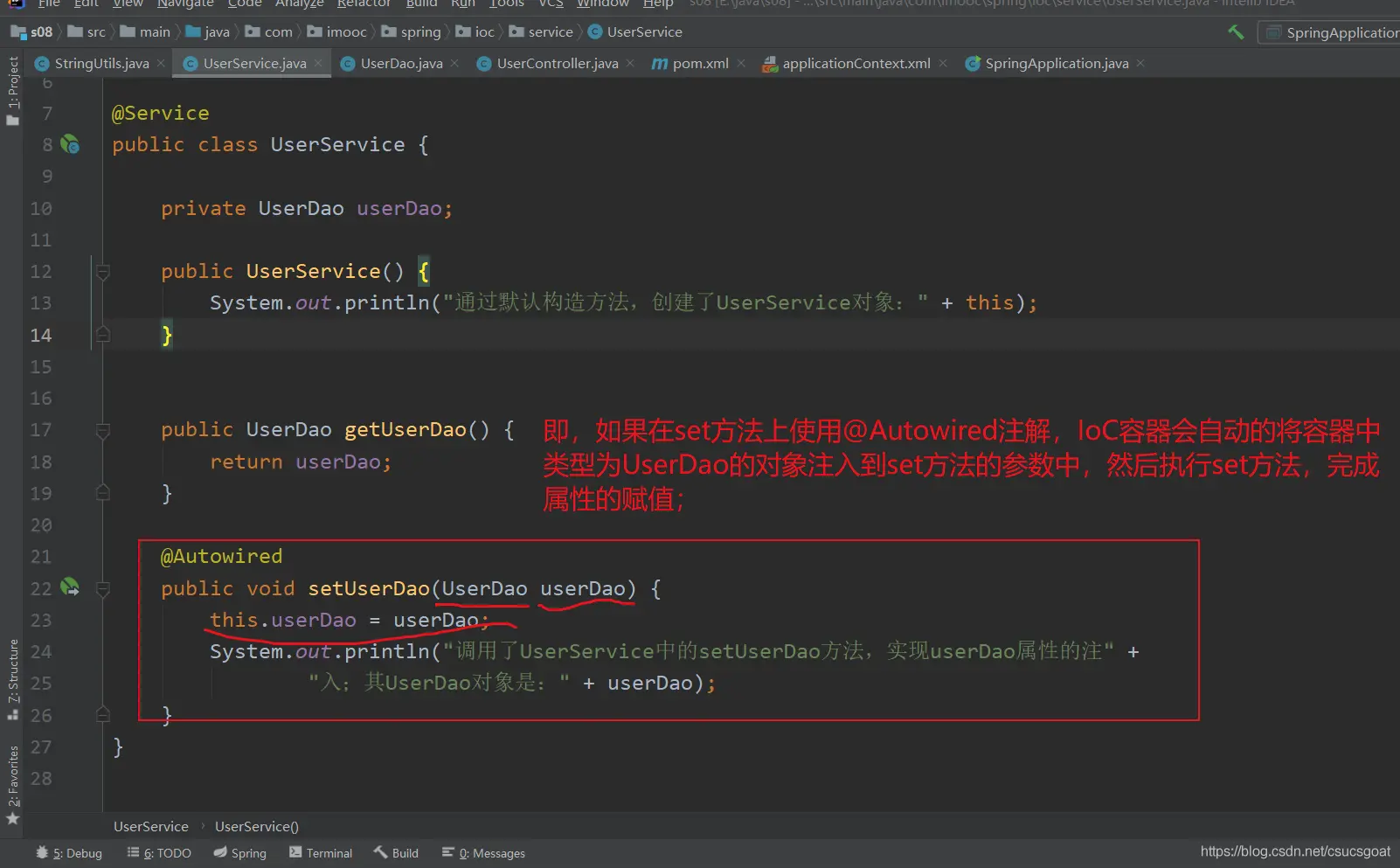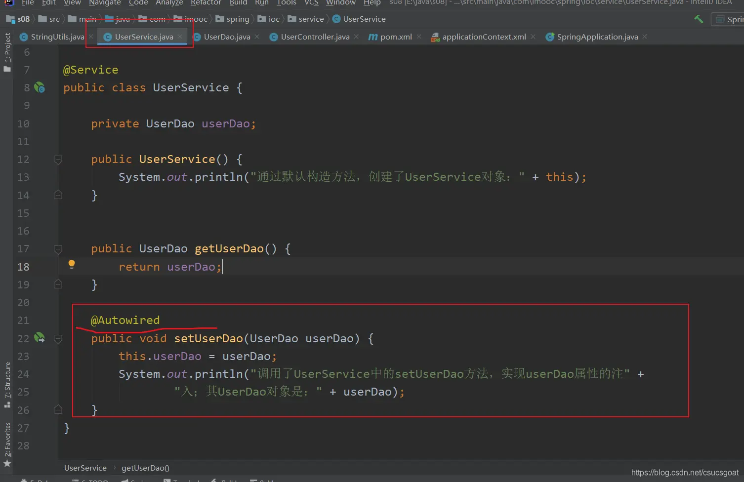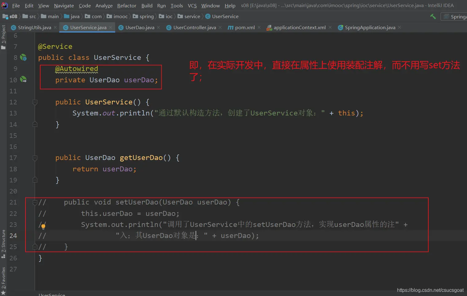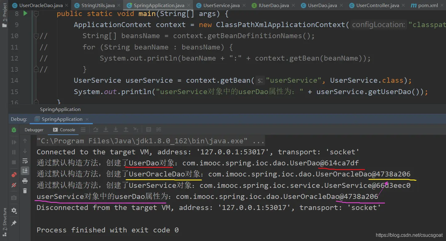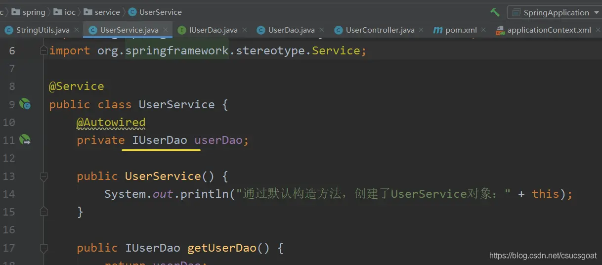 (1) 上面通过【使用XML方式,实现Spring IoC容器】的策略,分别创建了UserDao的对象,UserService对象;同时,利用setter实现对象依赖注入;
