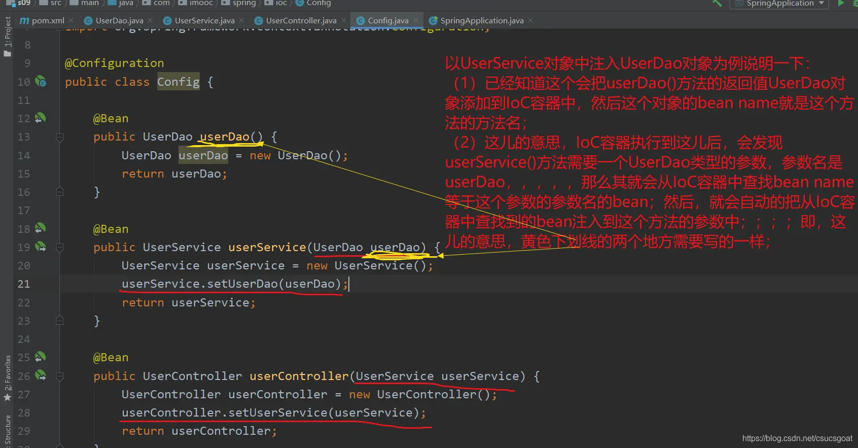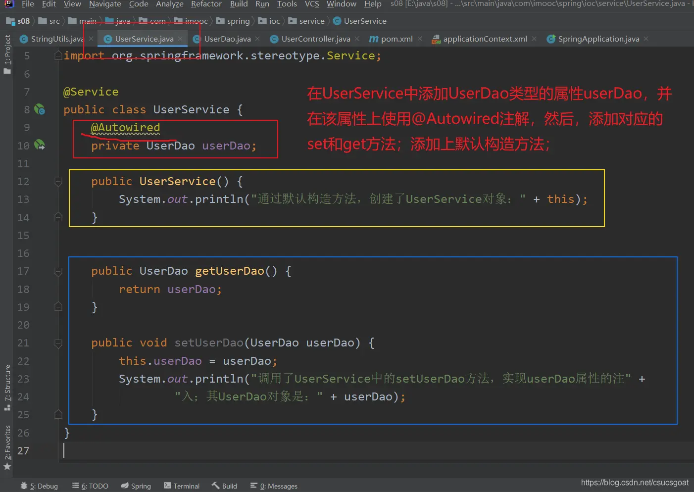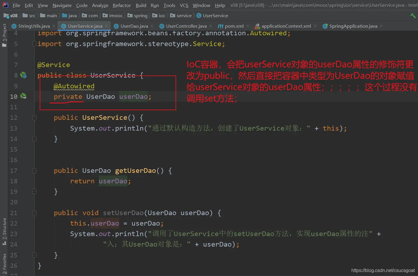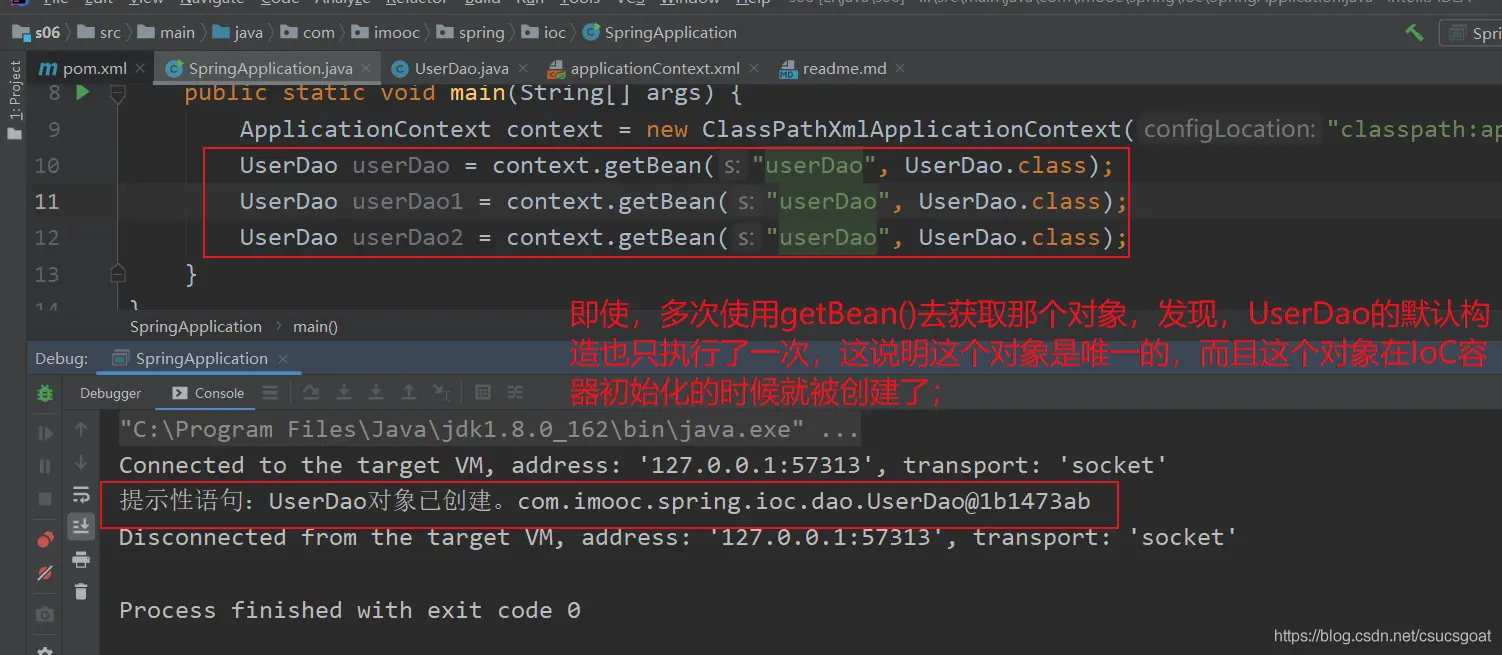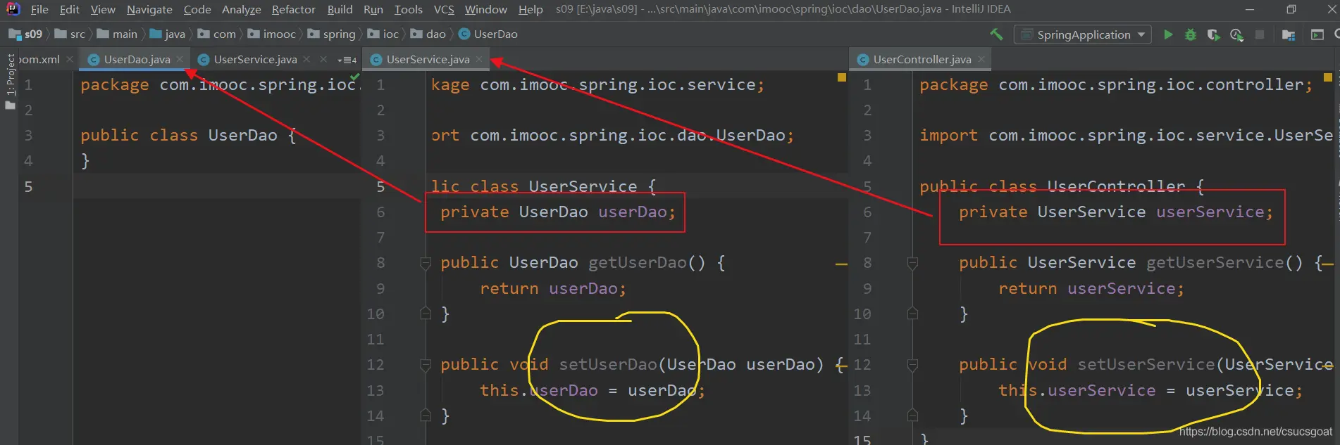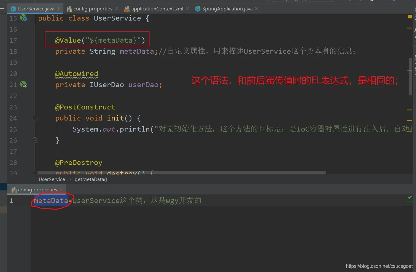 (1) 上面通过【使用XML方式,实现Spring IoC容器】的策略,分别创建了UserDao的对象,UserService对象;同时,利用setter实现对象依赖注入;