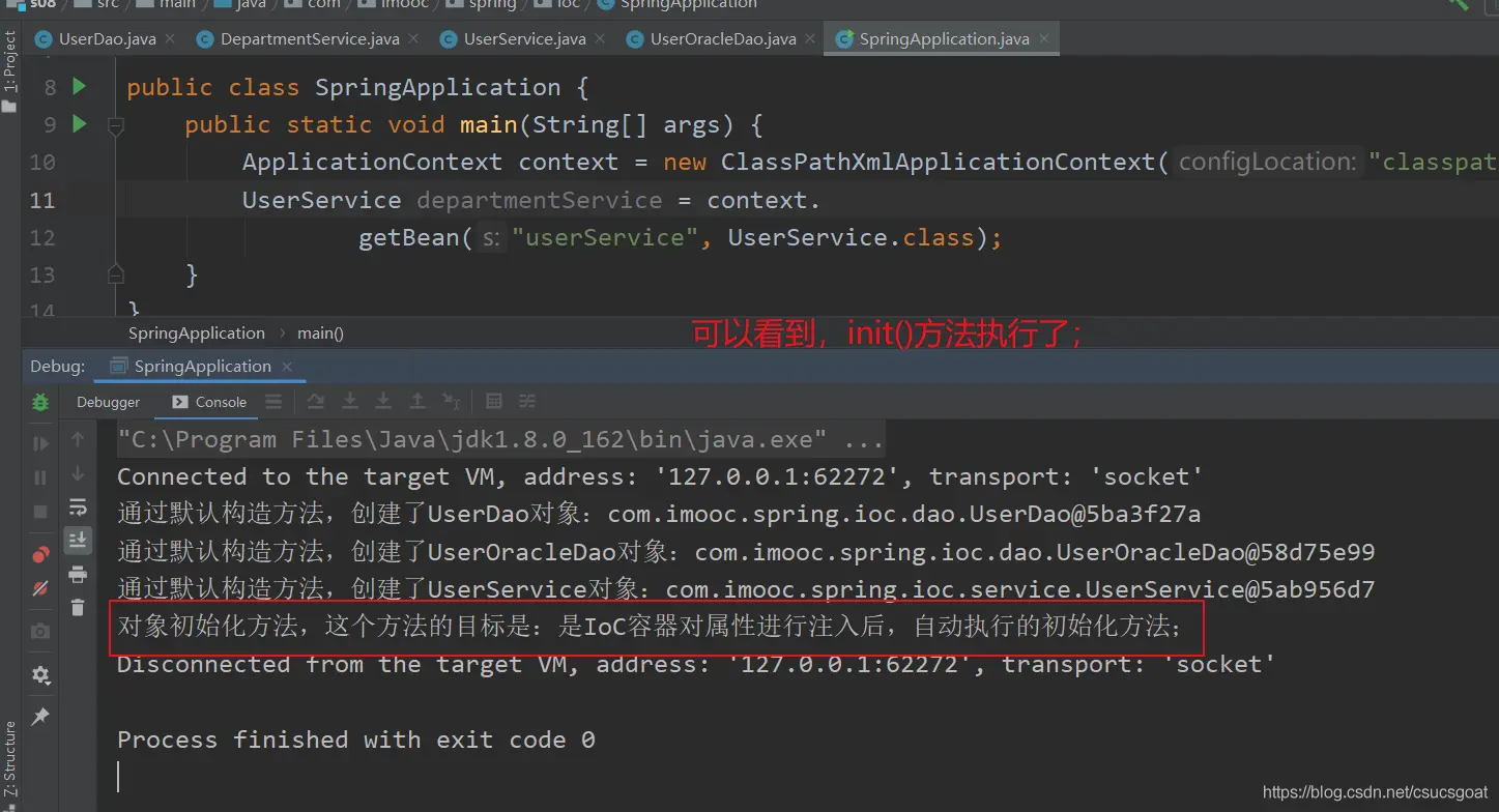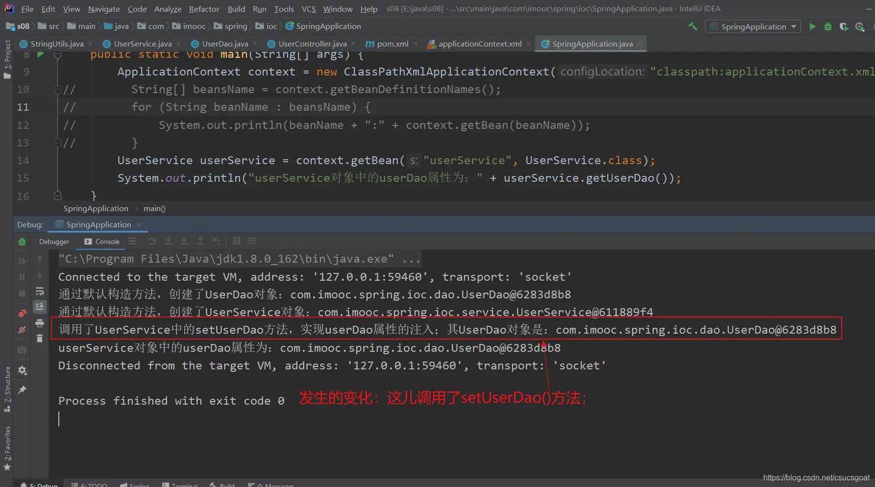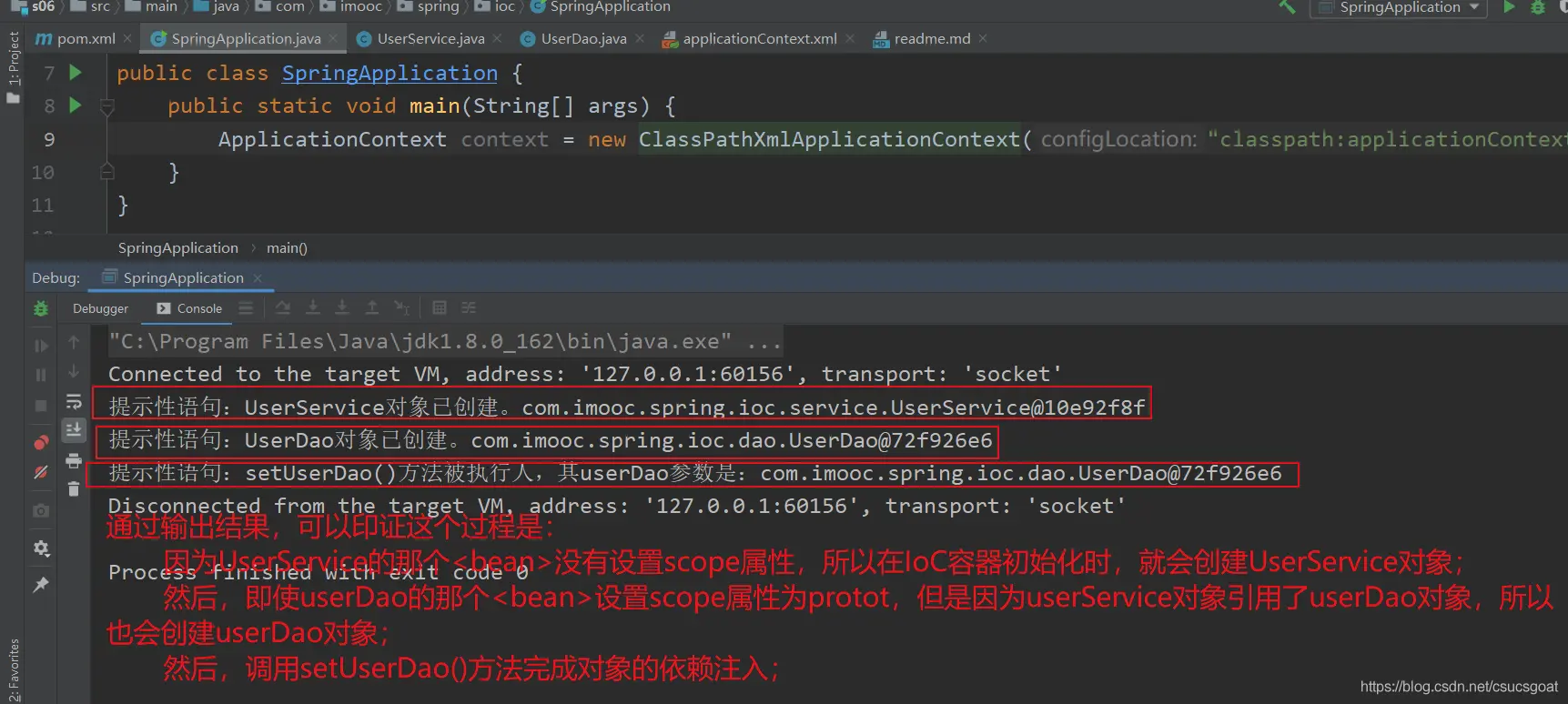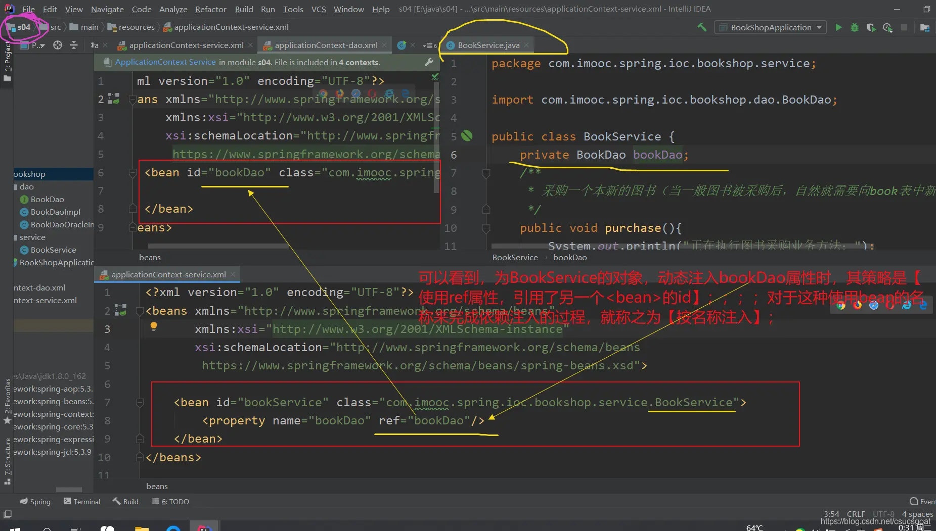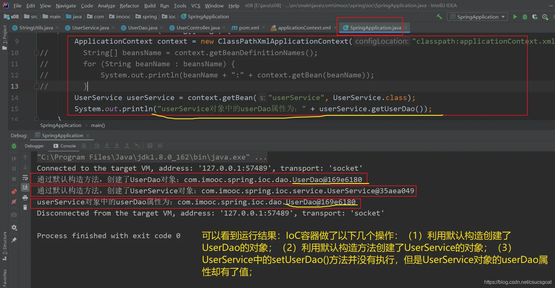 (1) 上面通过【使用XML方式,实现Spring IoC容器】的策略,分别创建了UserDao的对象,UserService对象;同时,利用setter实现对象依赖注入;