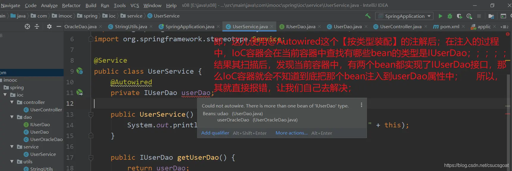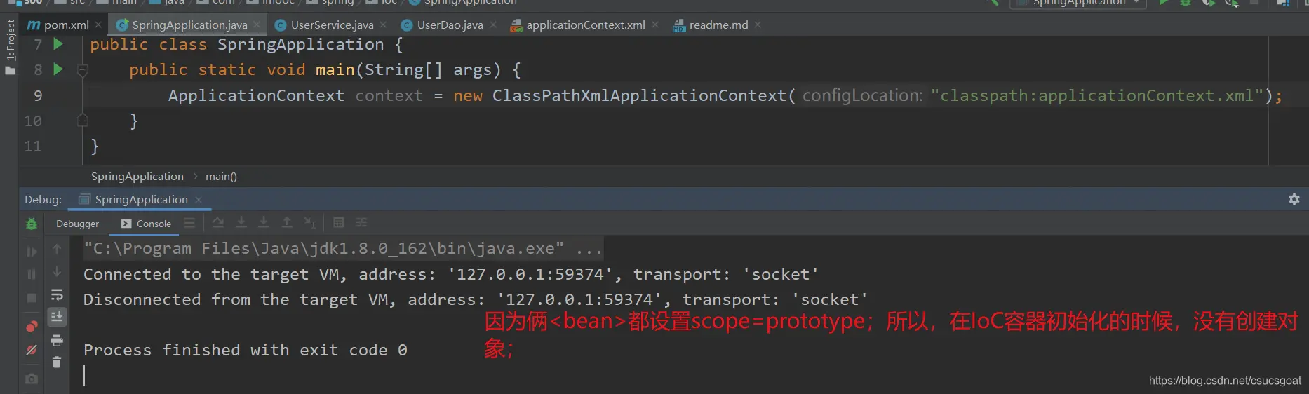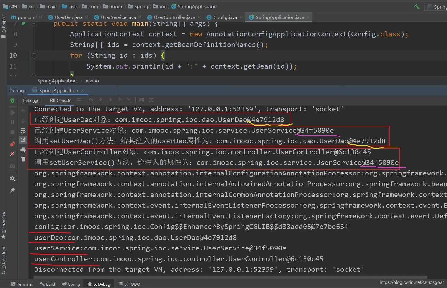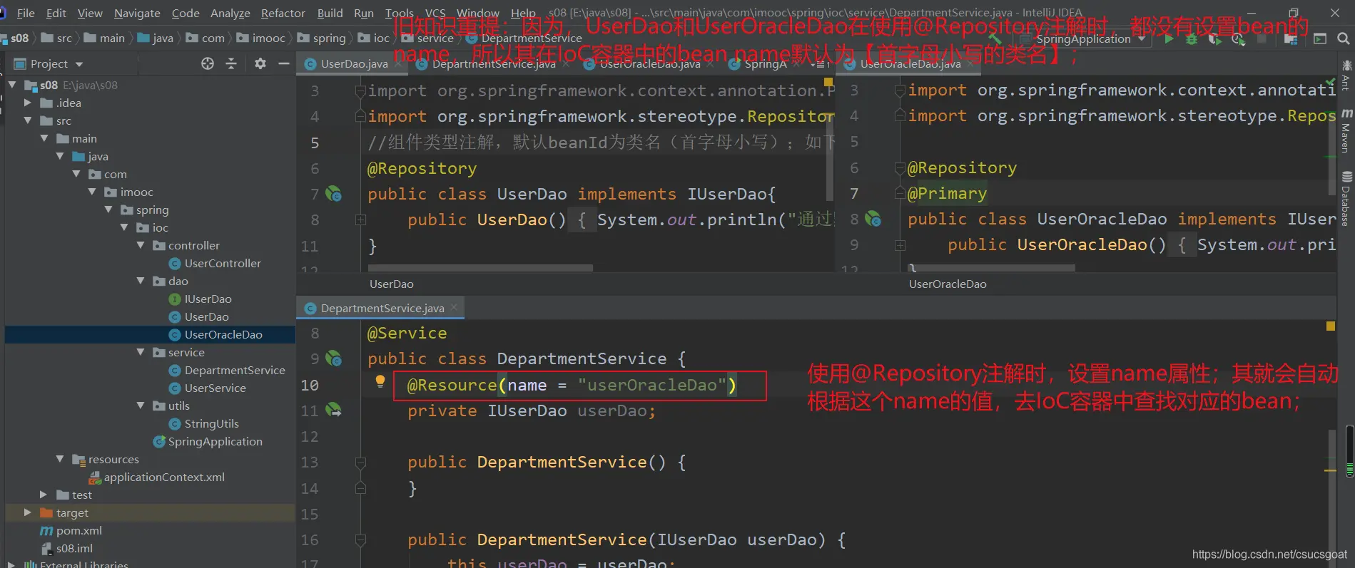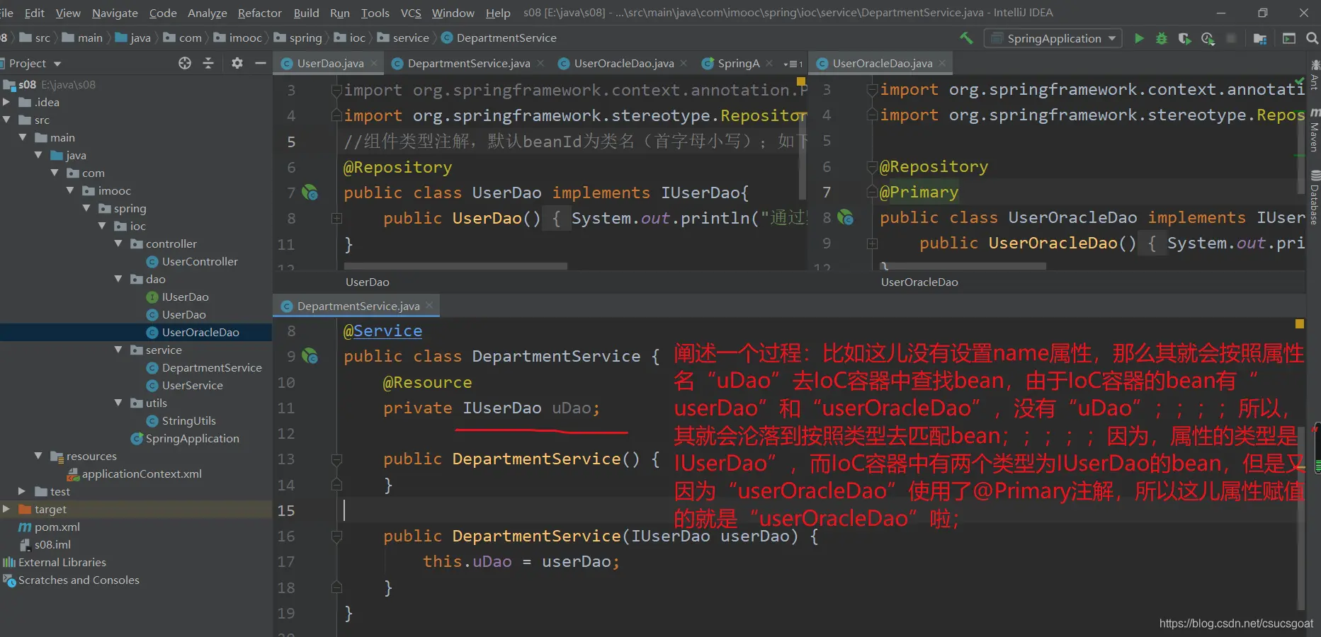 (1) 上面通过【使用XML方式,实现Spring IoC容器】的策略,分别创建了UserDao的对象,UserService对象;同时,利用setter实现对象依赖注入;