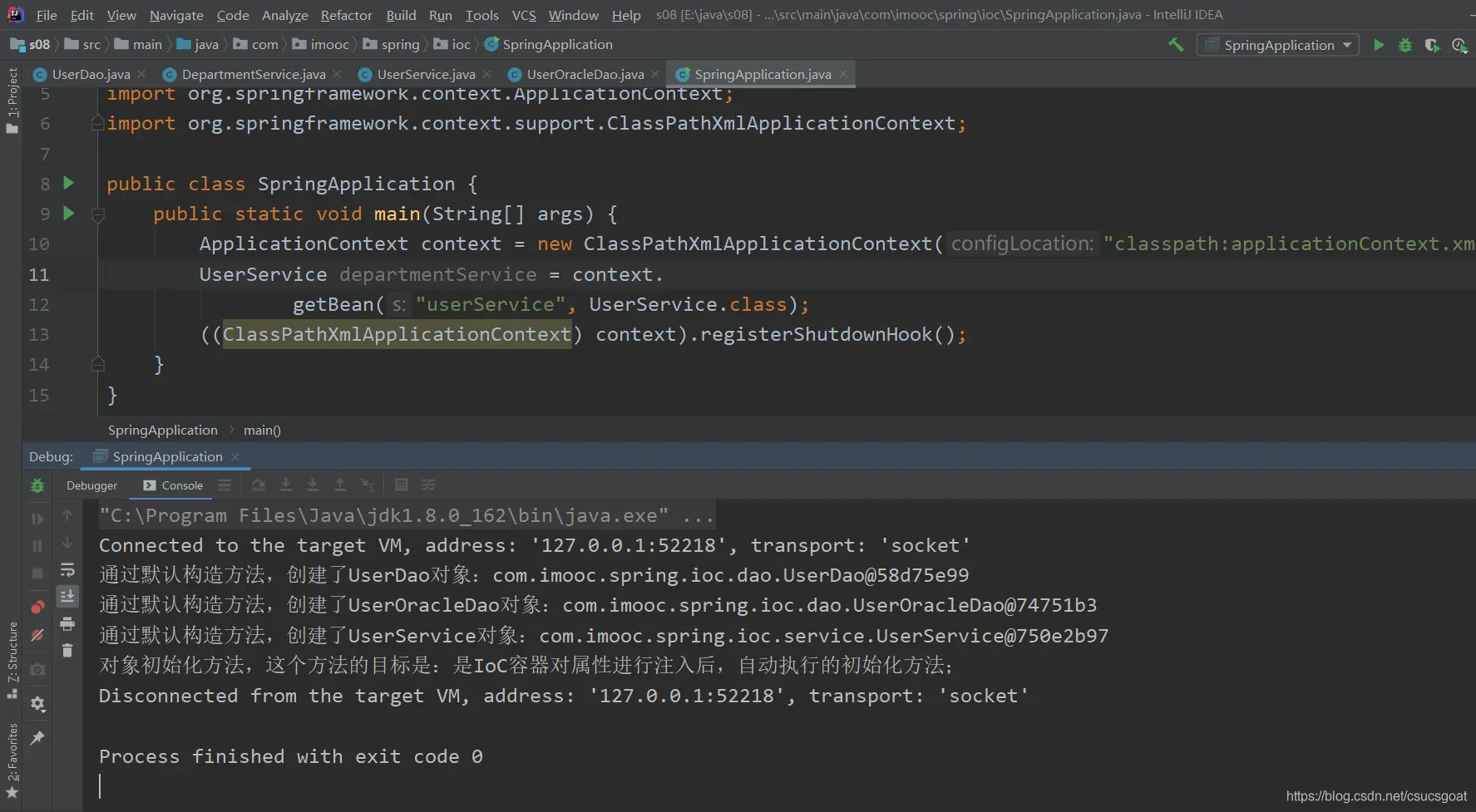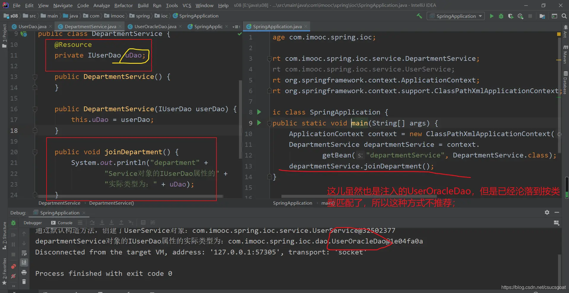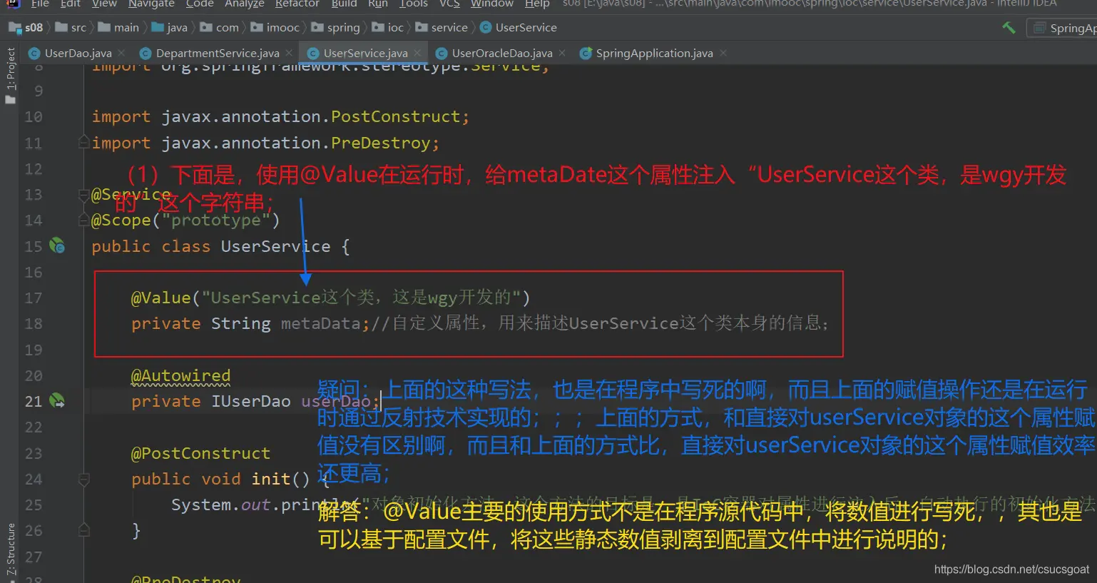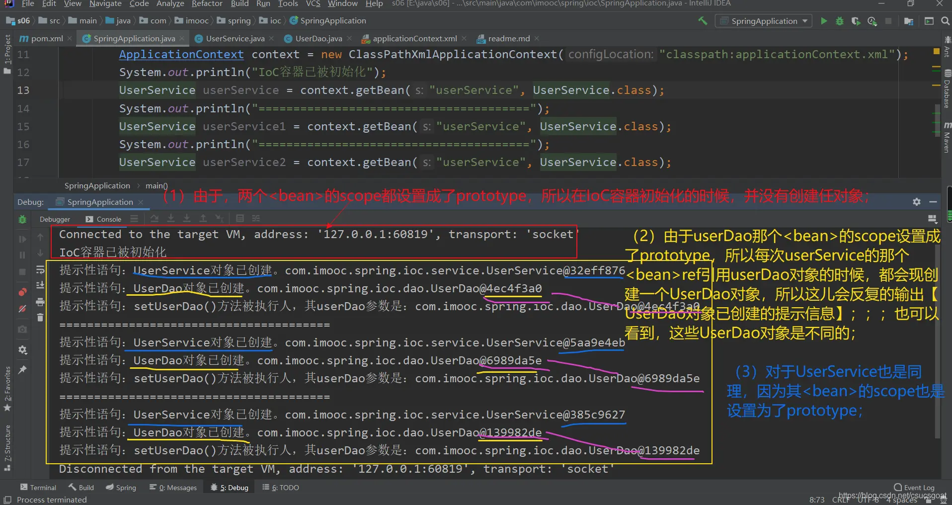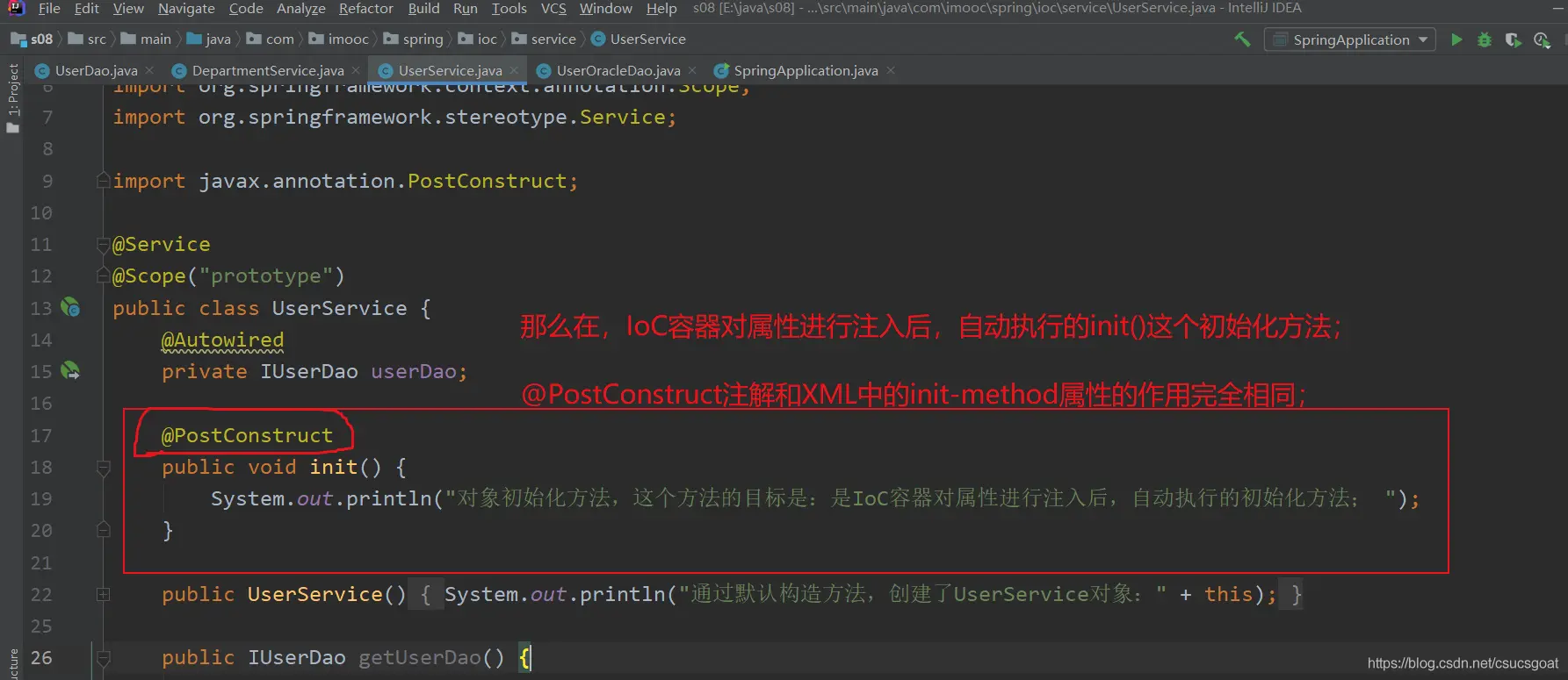 (1) 上面通过【使用XML方式,实现Spring IoC容器】的策略,分别创建了UserDao的对象,UserService对象;同时,利用setter实现对象依赖注入;