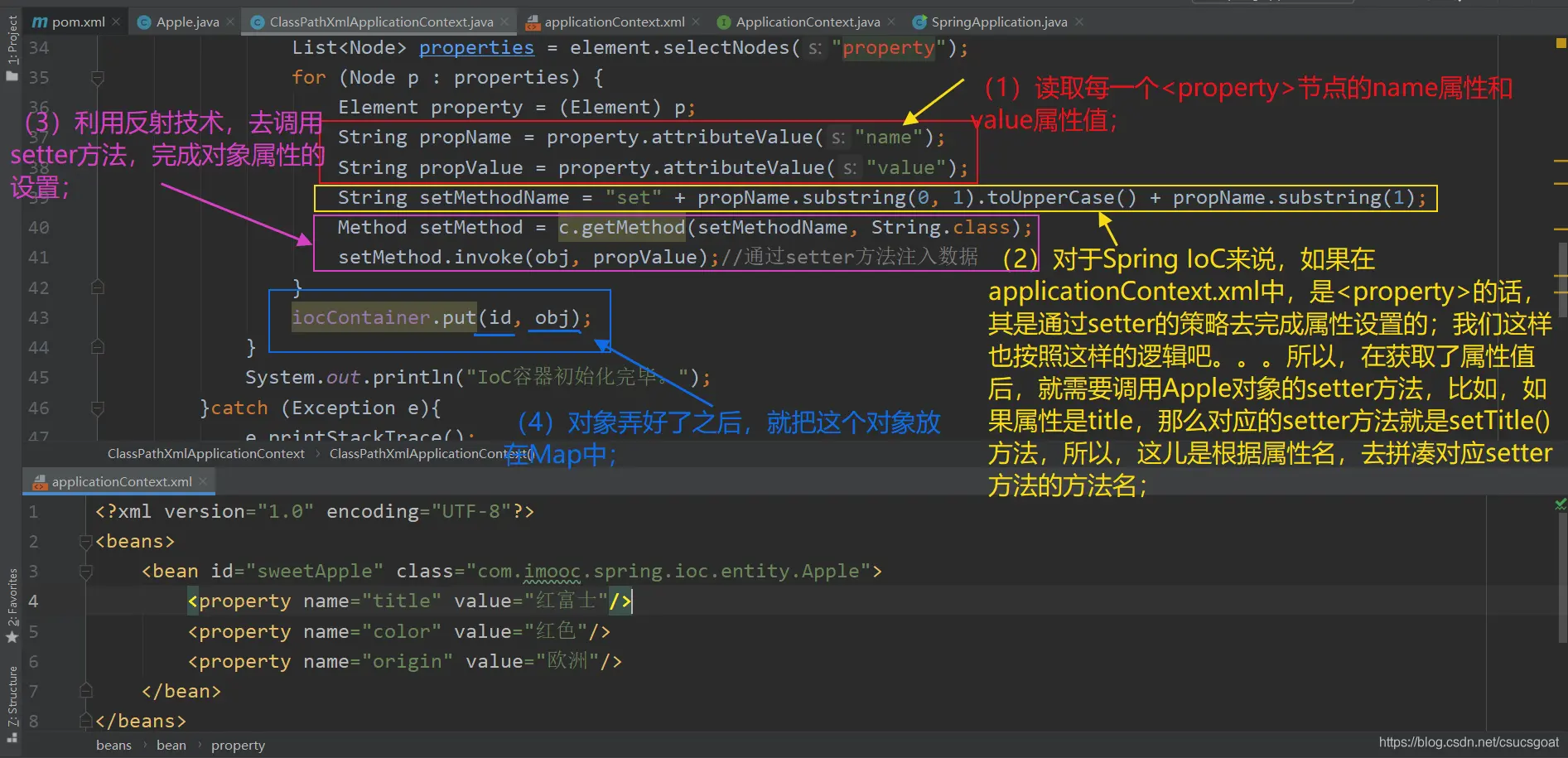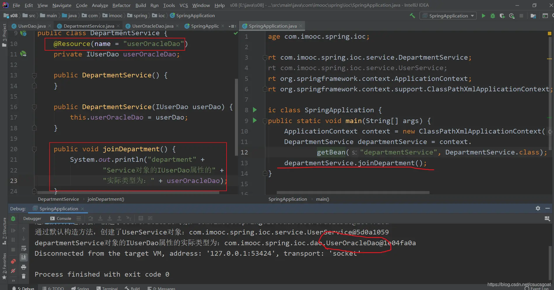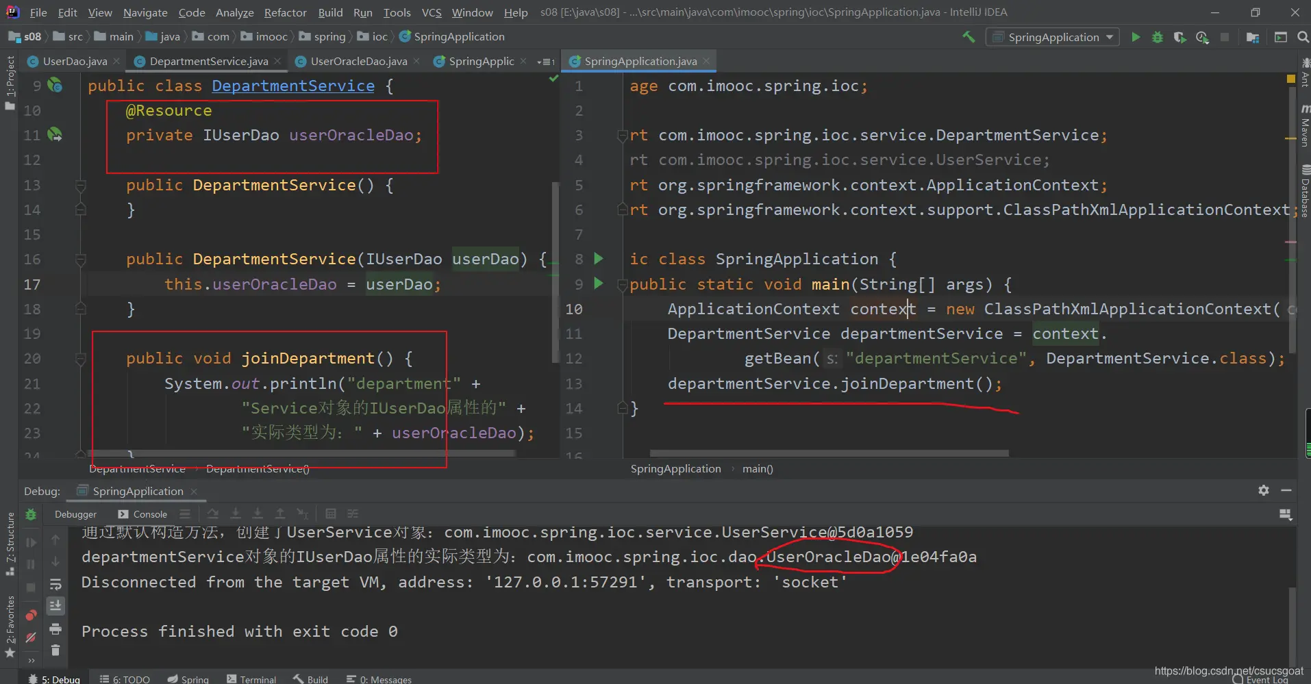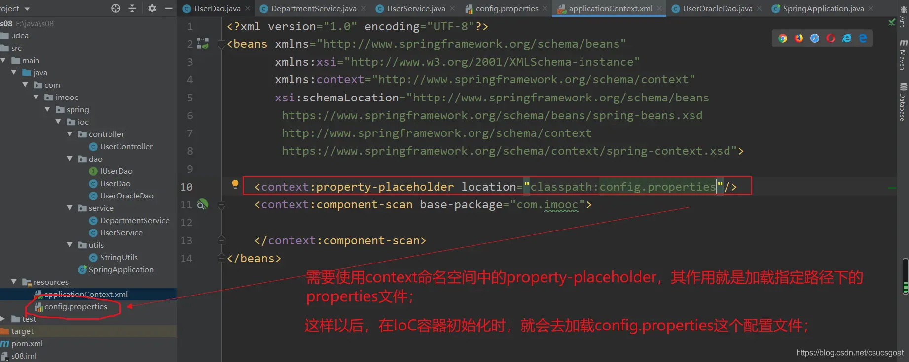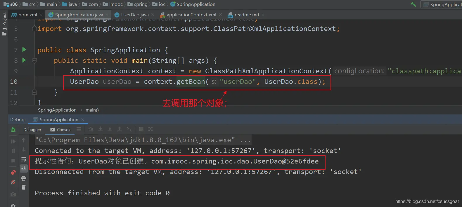 (1) 上面通过【使用XML方式,实现Spring IoC容器】的策略,分别创建了UserDao的对象,UserService对象;同时,利用setter实现对象依赖注入;