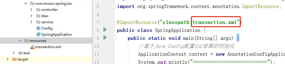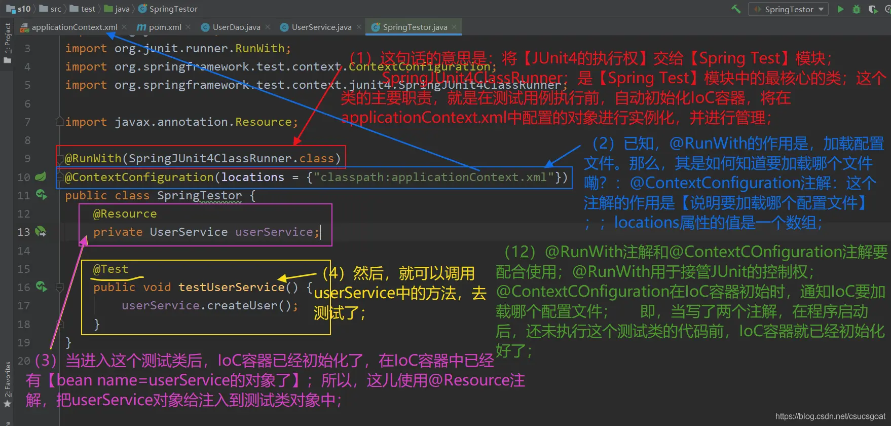 (2) 第二步:@RunWith注解 :将JUnit4的运行过程交给Spring来完成,通过这个注解,可以让Spring接管JUnit4的控制权,完成IoC的初始化工作; @ContextConfiguration注解:用于说明,在初始化IoC容器过程中,要加载哪个配置文件;