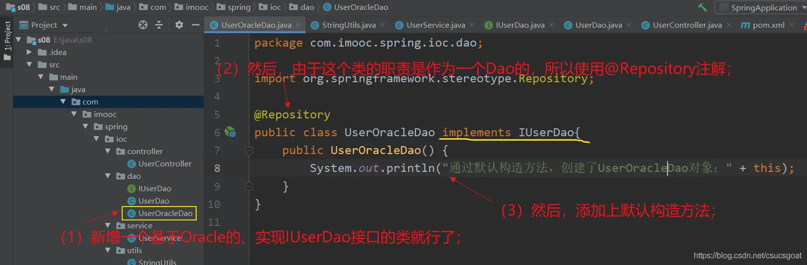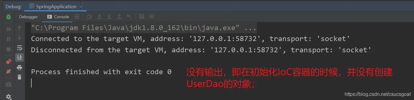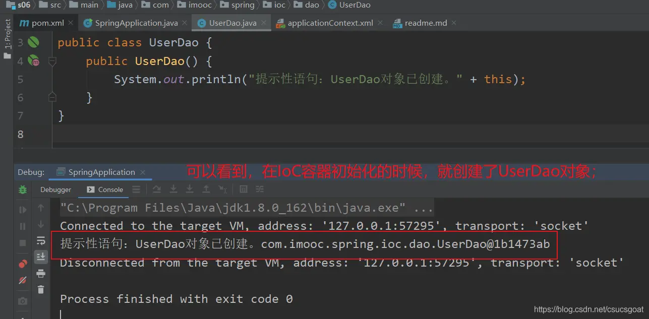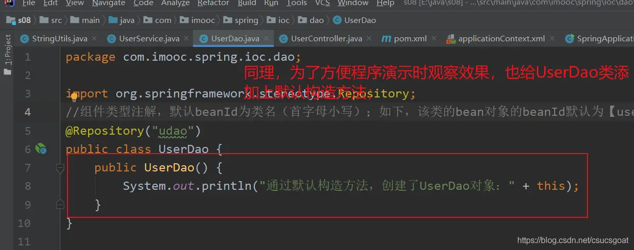 (1) 很简单,UserDao只在默认构造方法中,输出了一句话。那么在基于【默认构造方法】创建UserDao对象的时候,就会输出这句话;
