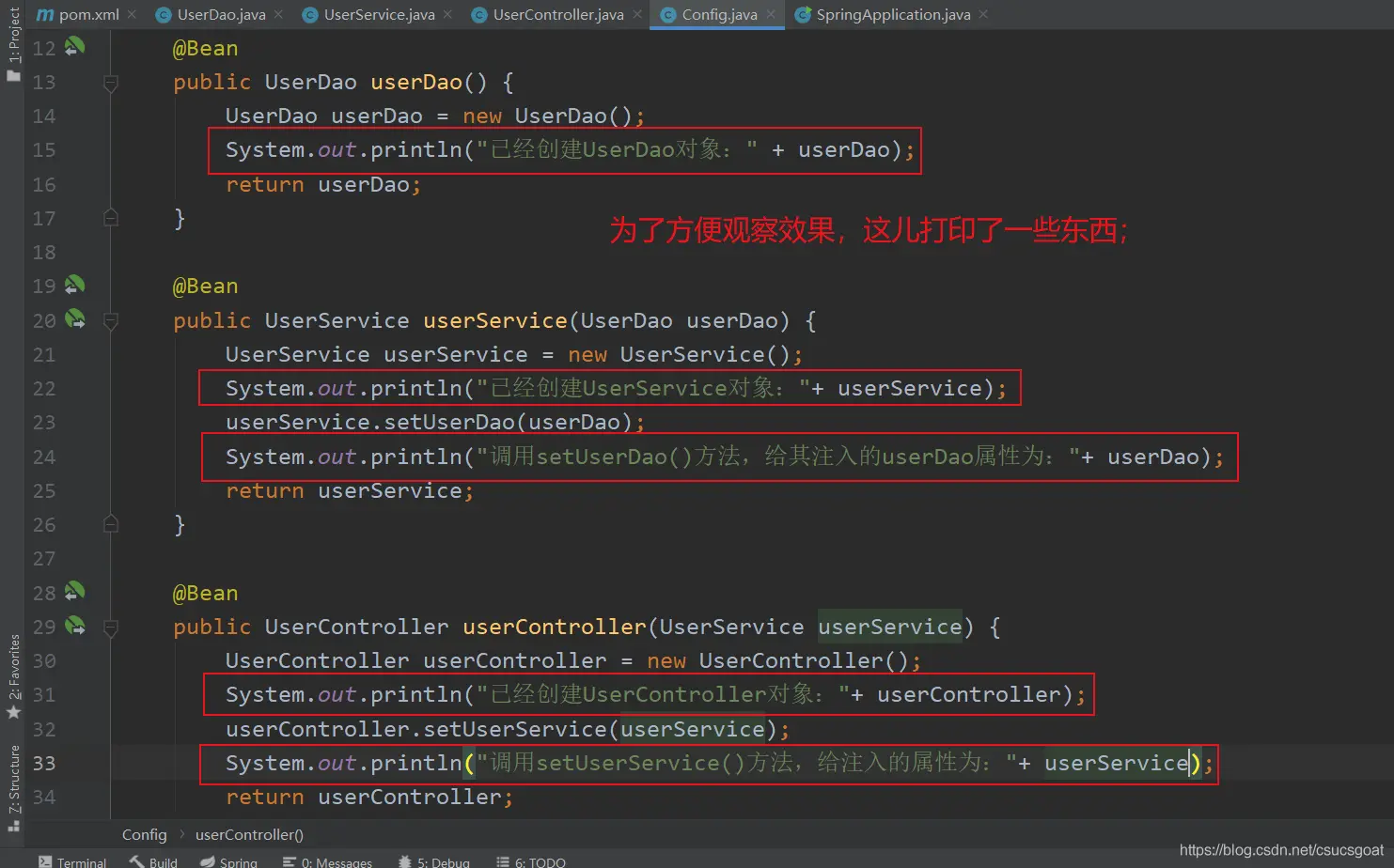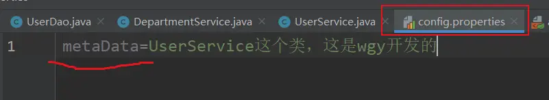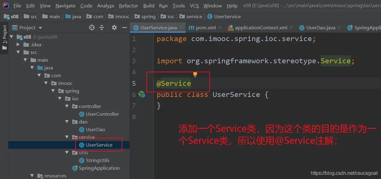 (1) UserDao类和UserService类没什么好说的,就是模拟一下,简单的调用关系而已;