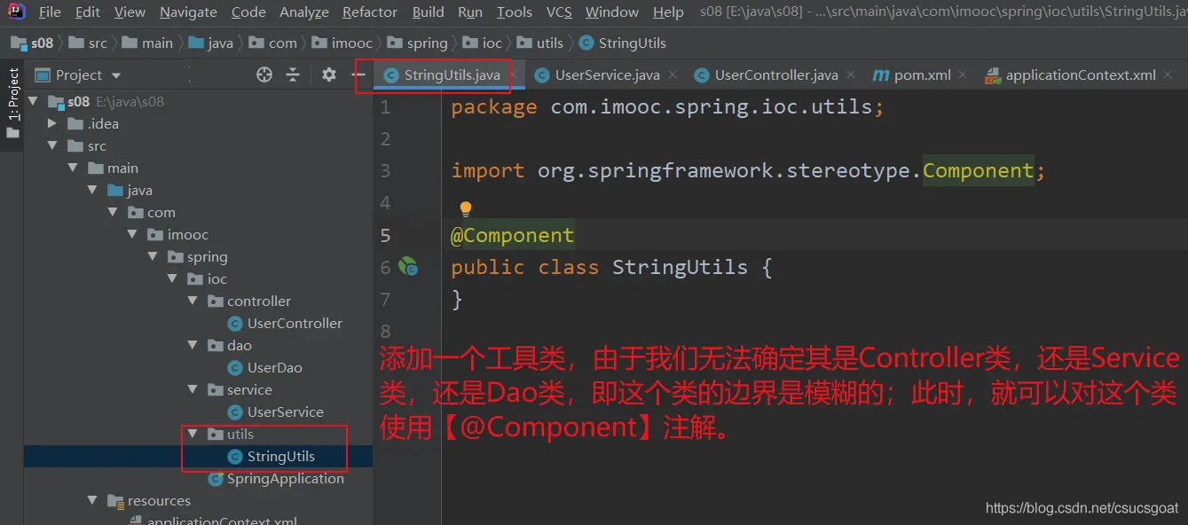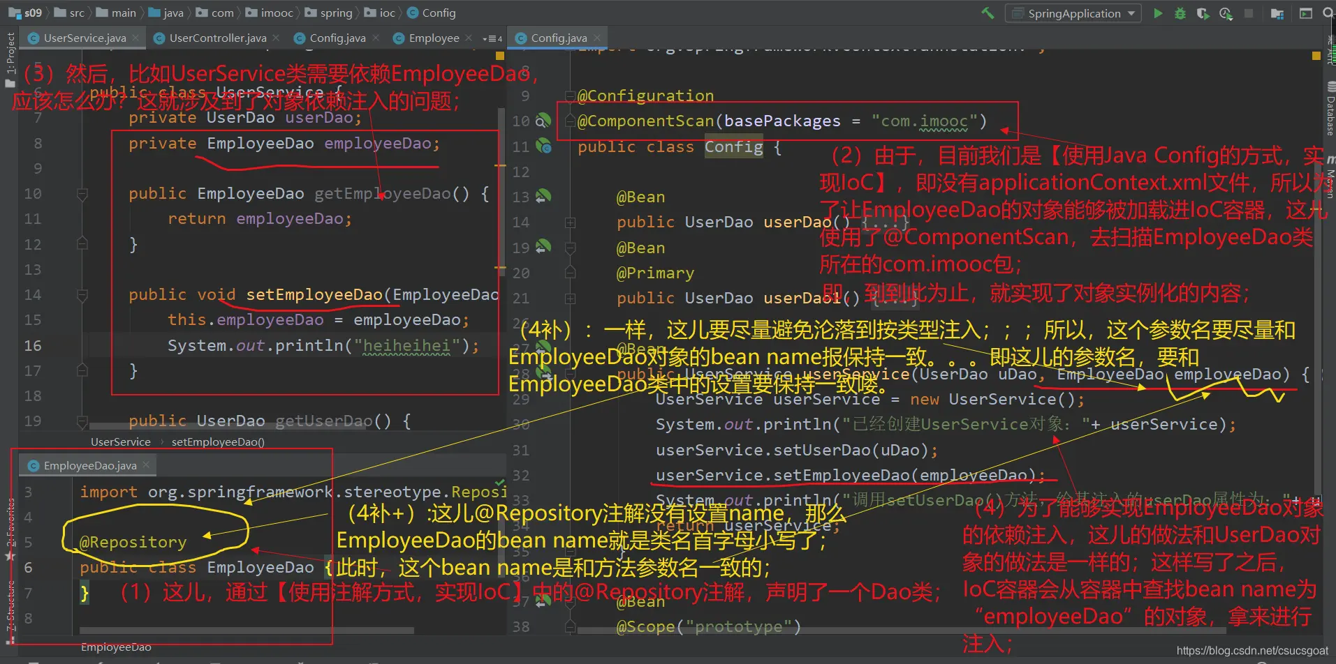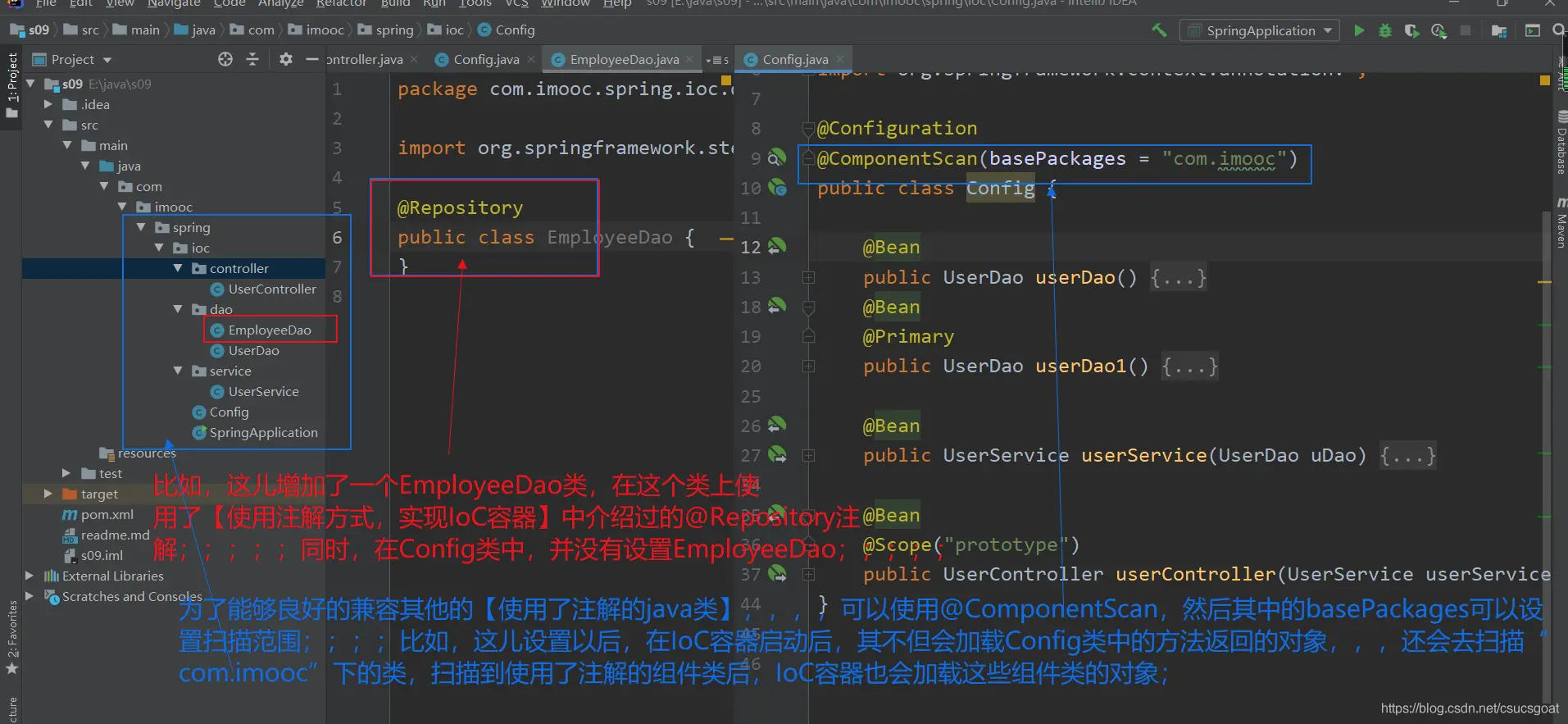 (3) 本篇博客还介绍了【java Config方式,实现IoC】和【使用注解的类】是兼容的问题,这其中涉及到了@ComponentScan;
