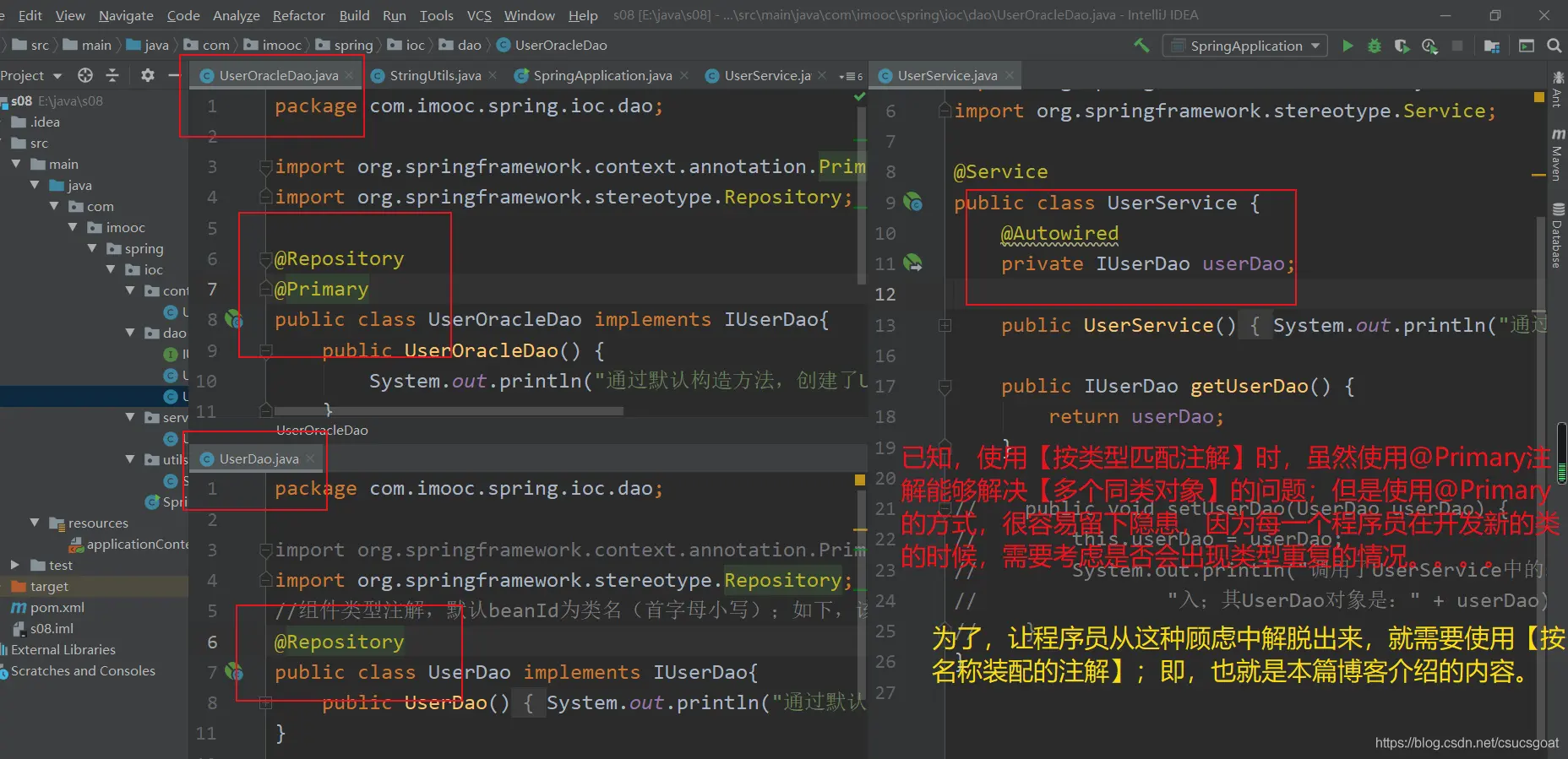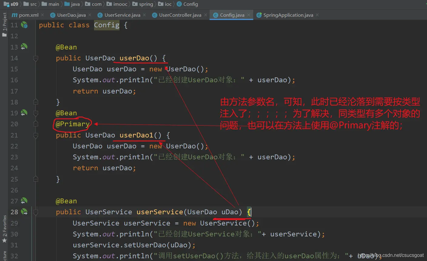 (1) 本篇博客内容:介绍【java Config方式,实现IoC】中的对象依赖注入的问题; (2) 为了应对按类型注入时的【同类型,有个对象的问题】,也可以在方法上使用@Primary注解;为了使对象是多例的,也可以在方法上使用@Scope注解;