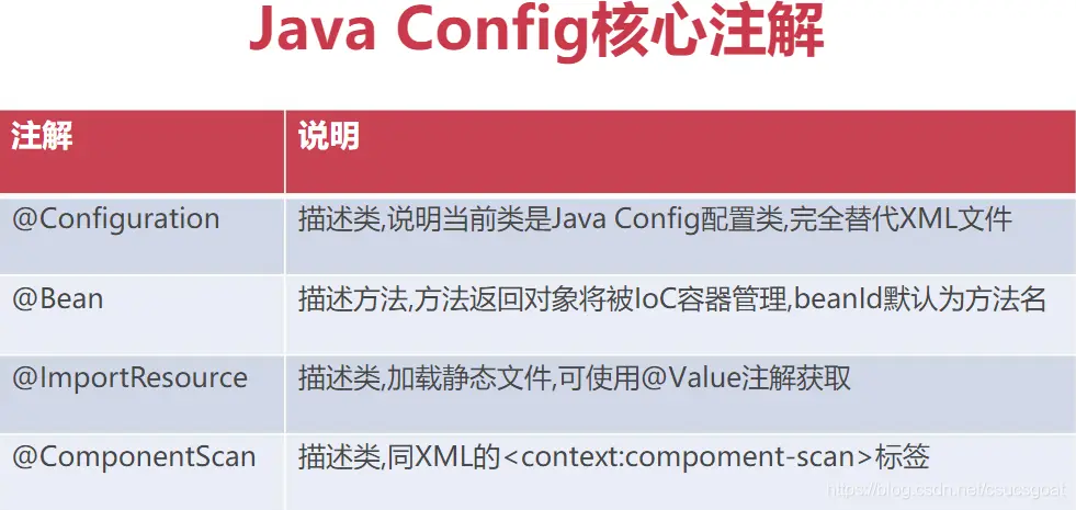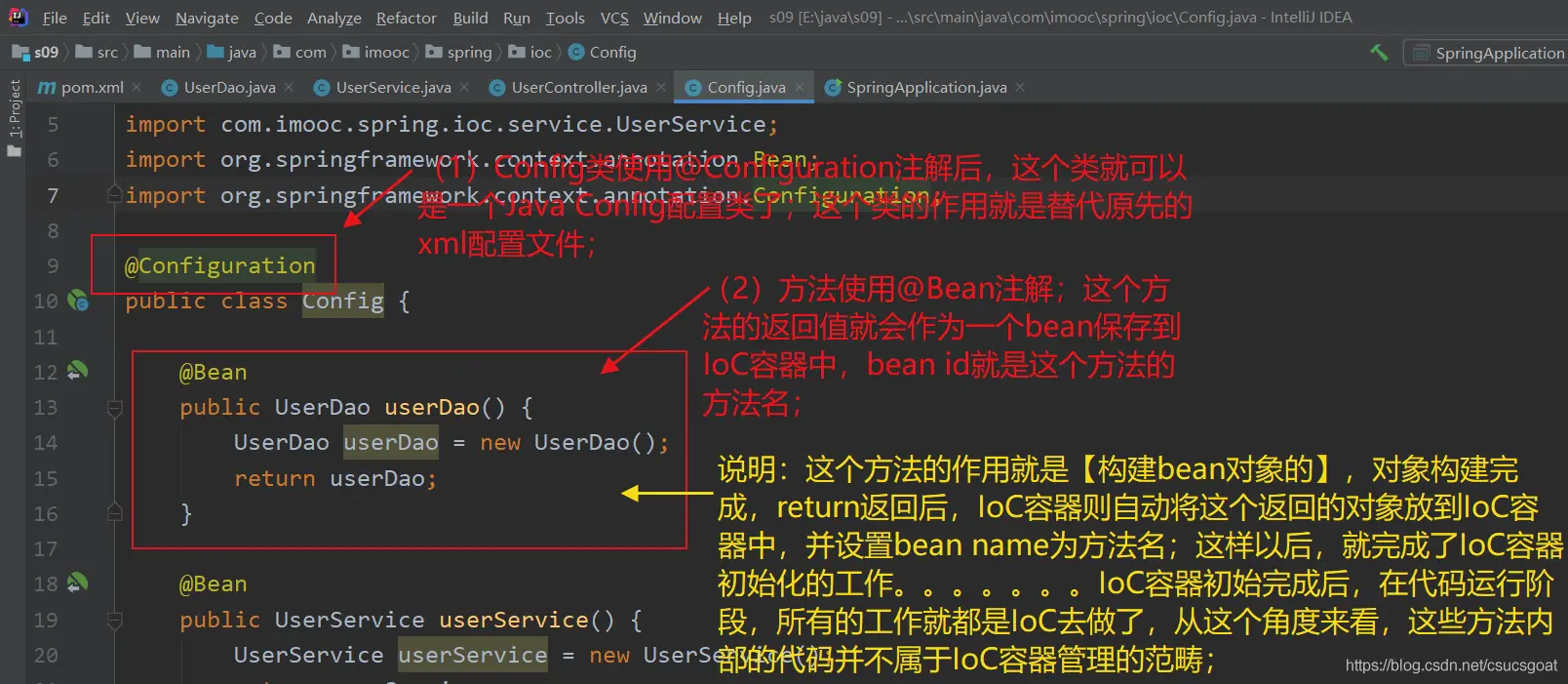 (1) 【java Config方式,实现IoC】中的Config类,其作用就是完全替代applicationContext.xml的;只是,外在表现上,是通过代码方式实现的而已;