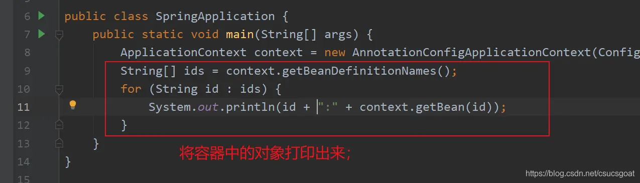 (2) 【context.getBeanDefinitionNames();】获取容器中所有对象的bean name的数组;