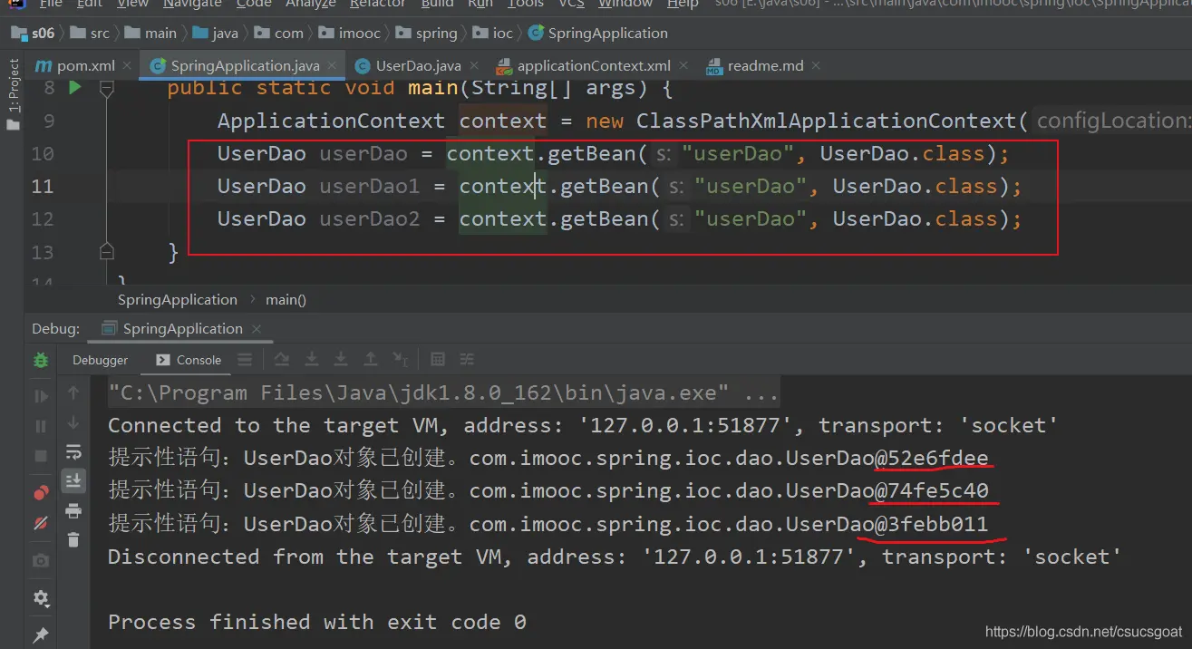 ●如上,在每一次【ref=“userDao”,产生对象注入】或者【getBean(“userDao”),获取id=UserDao这个<bean的对象】时,IoC容器都会创建一个新的实例;这就意味着【id是“b1”,“b2”,“b3”的<bean对应的对象】都拥有的是自己独占的一个【id=“UserDao”这个<bean对应的对象】;