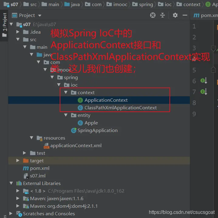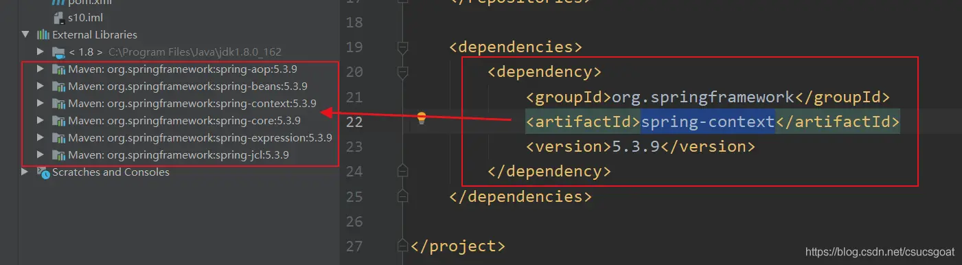 (1) 在【使用XML方式实现Spring IoC:IoC容器完成【对象的实例化】】中第一次介绍了如下情况,引入【spring-context】这个依赖后,其会自动下载6个相关的依赖和底层依赖;