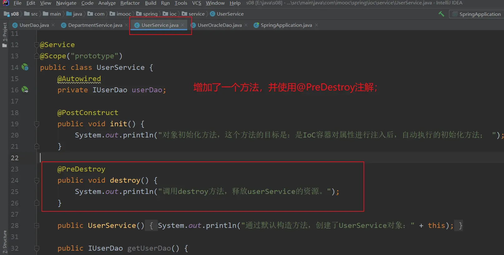 (2) 介绍@PreDestroy注解时的内容。 @Scope定义为prototype类型,则实例创建之后spring就不在管理了,它只是做了new操作而已;@Scope定义为singleton类型,则实例创建之后spring会继续管理这个实例对象;
