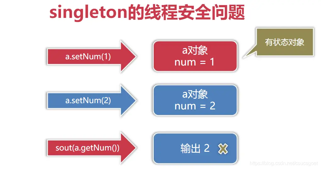 ●如上A用户(红色箭头代表),调用了a对象的setNum()方法,设置a对象的num属性值为1;但是,A用户(红色箭头表示)还没来得及读取a对象的num值时,B用户(蓝色箭头表示),调用了a对象的setNum()方法,设置a对象的num属性值为2;因为全局只有一个a对象,而且这个a对象被A用户和B用户共享,自然a对象的num值就变成了2;这样以后,A用户(红色箭头代表)去调用输出a对象的num属性值时,num的值就变成了2了。由此,问题就出现了。
