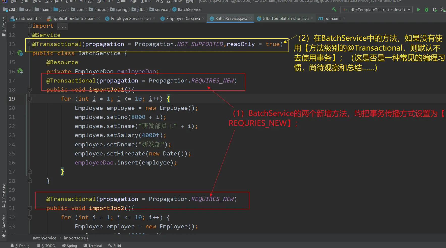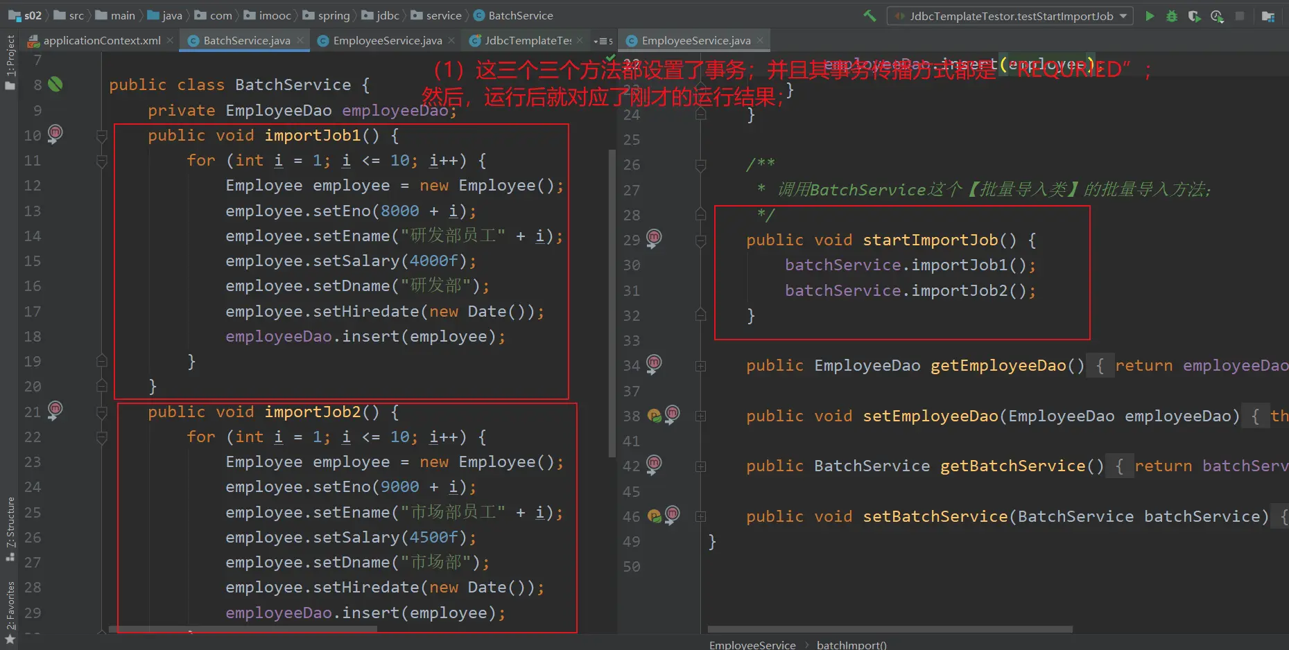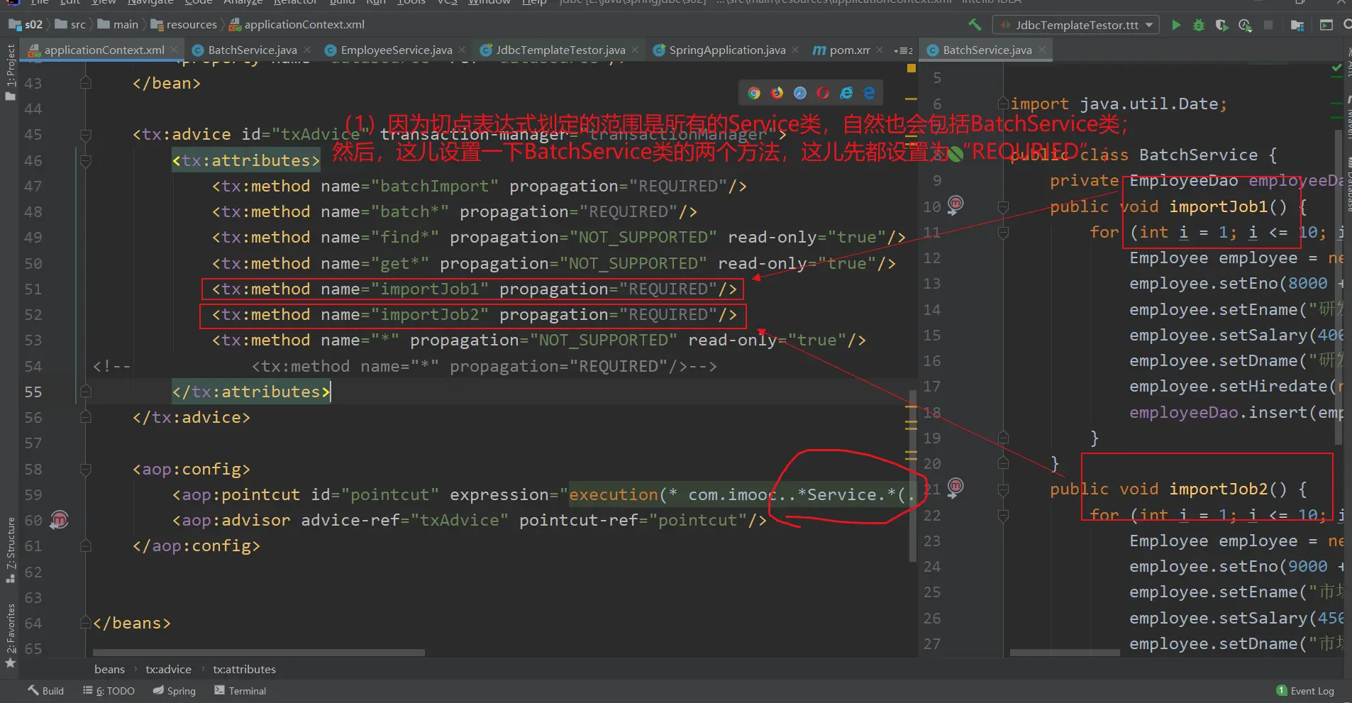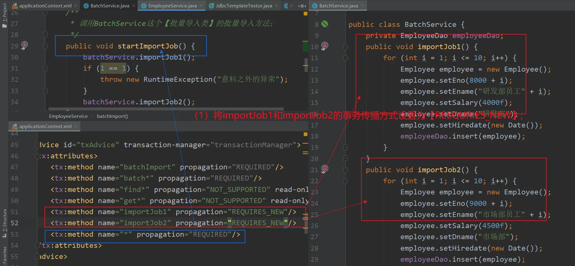 (3)在IoC容器中配置BatchService对象;在EmployeeService对象中注入BatchService对象;设置BatchService两个方法的事务传播方式;