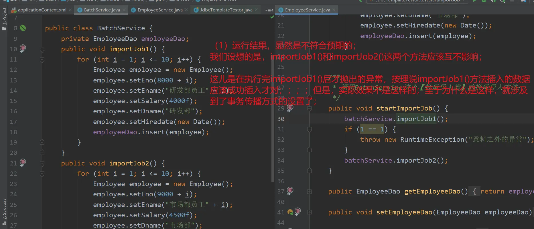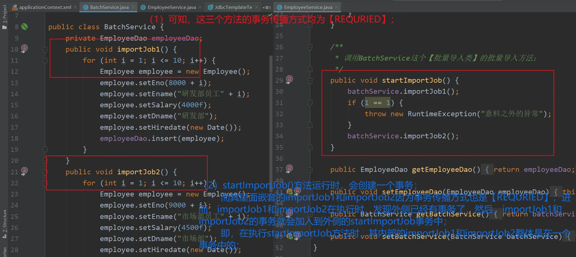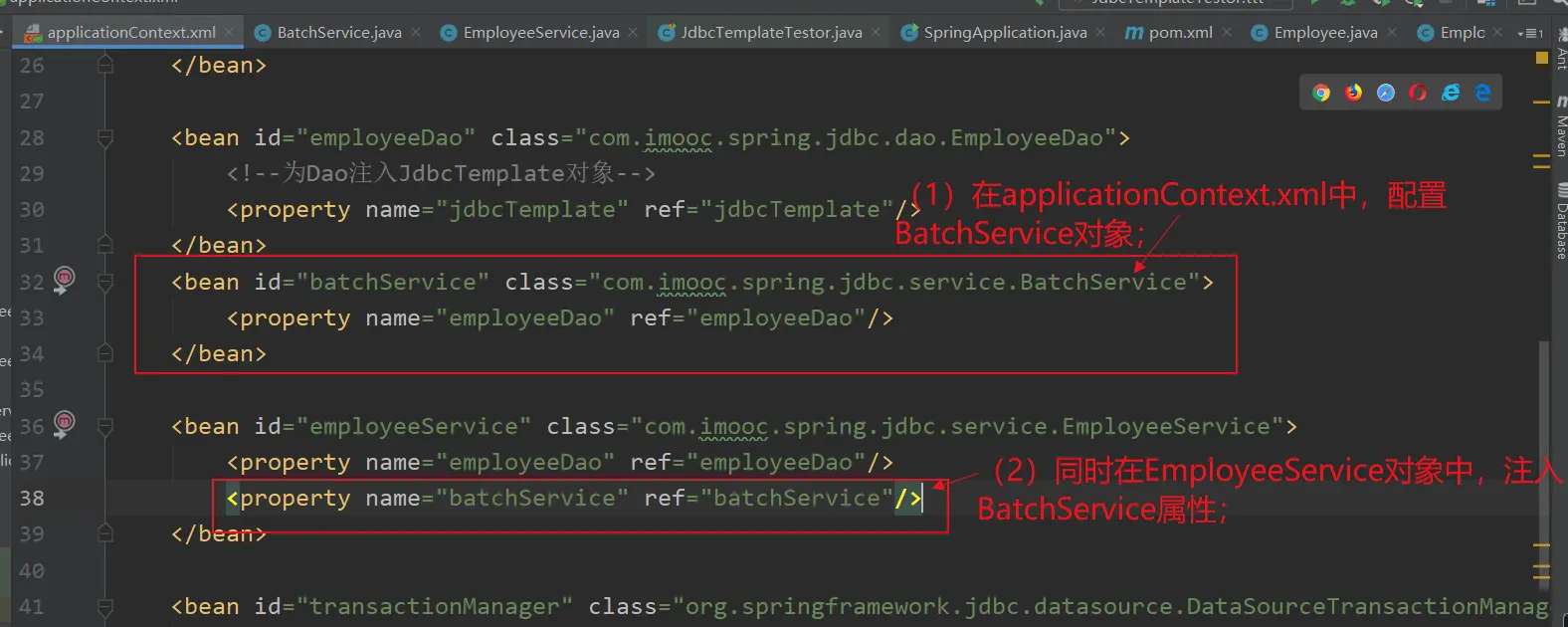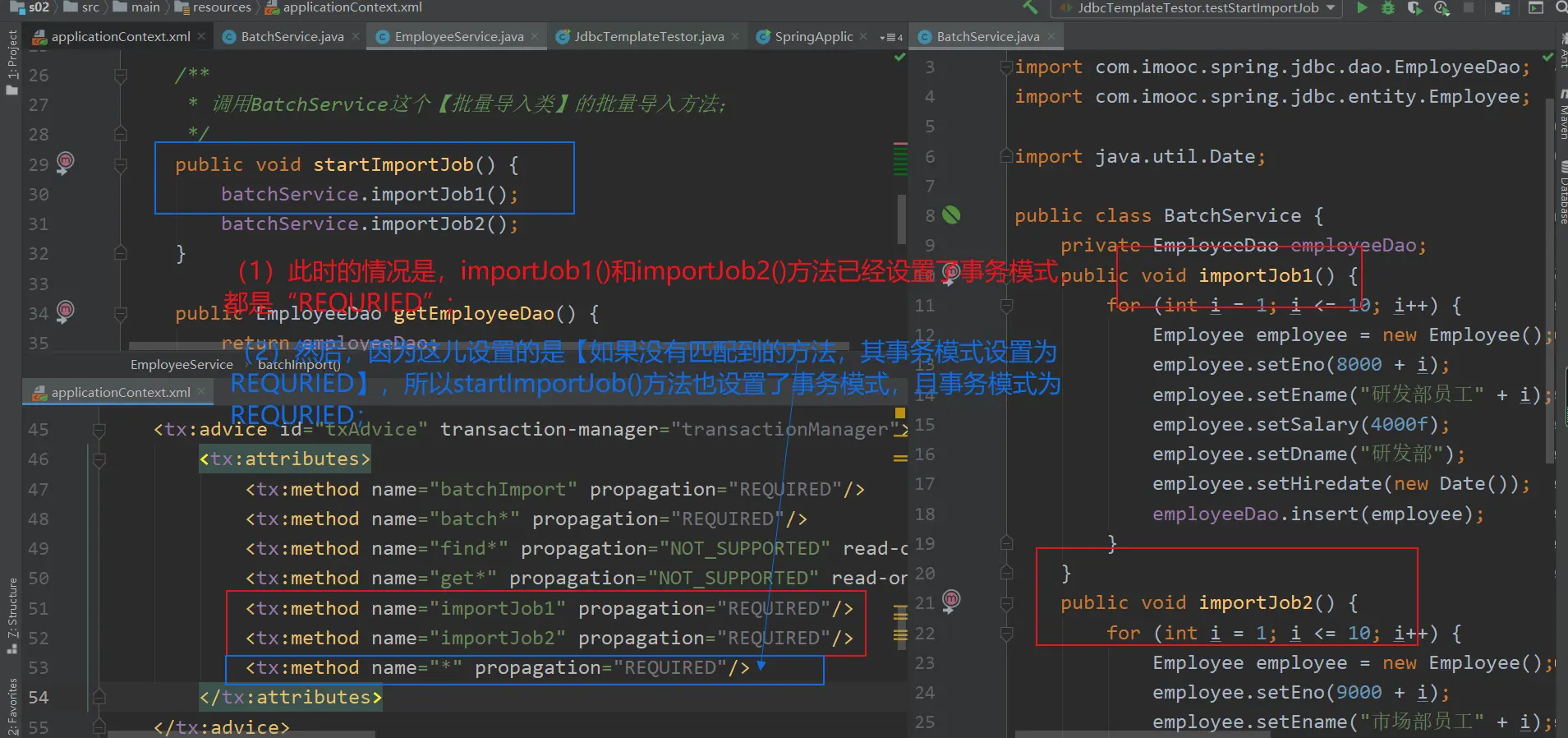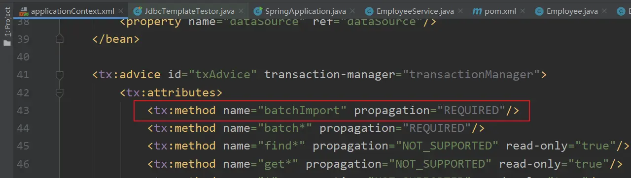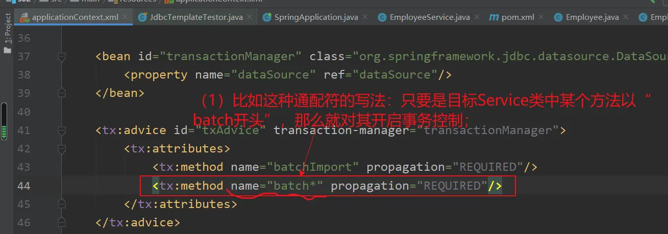 (3)在IoC容器中配置BatchService对象;在EmployeeService对象中注入BatchService对象;设置BatchService两个方法的事务传播方式;