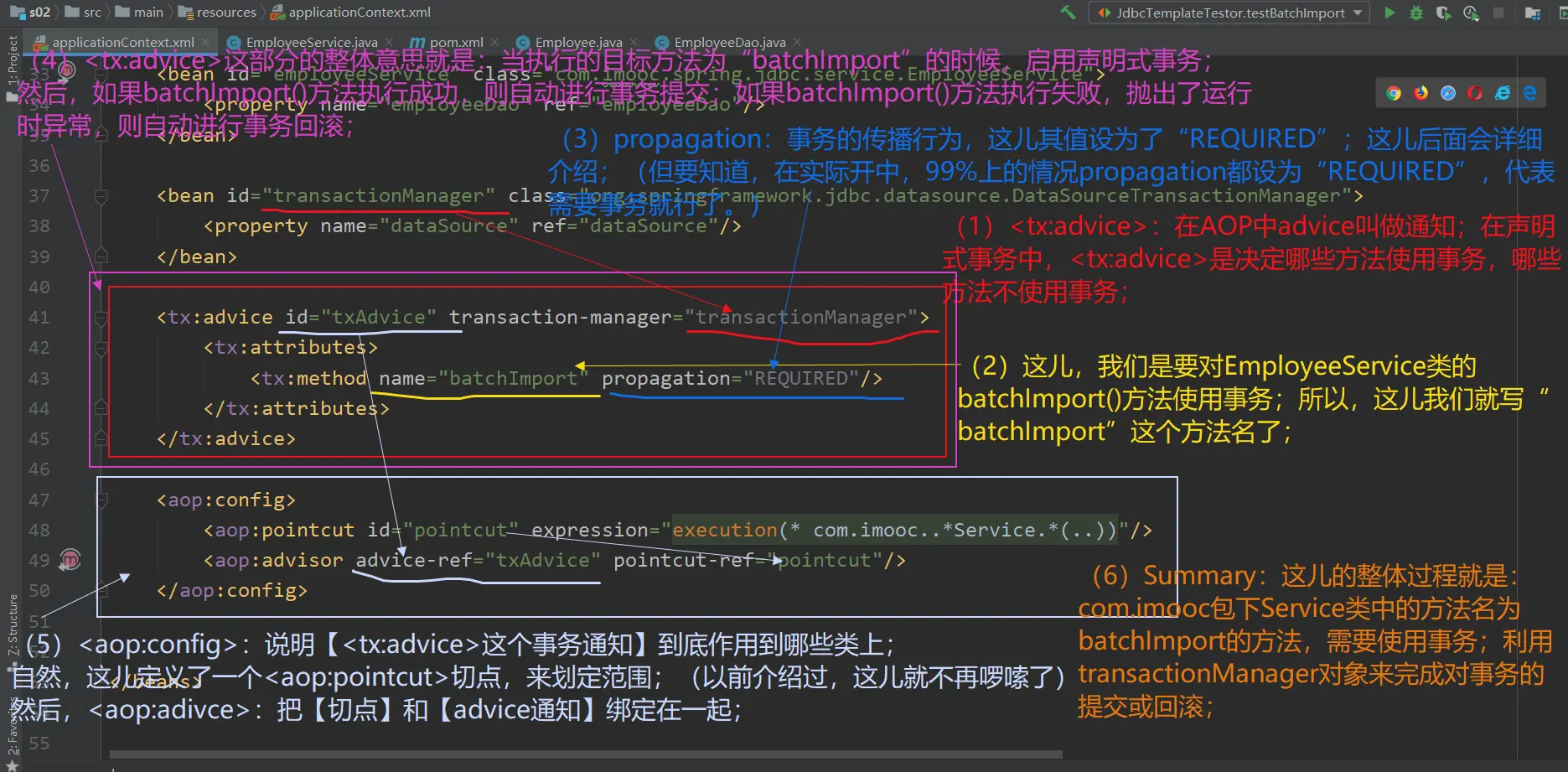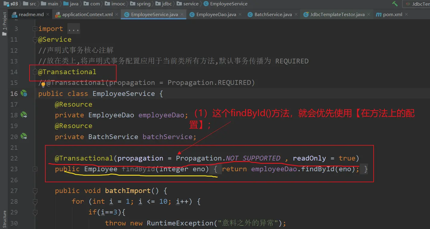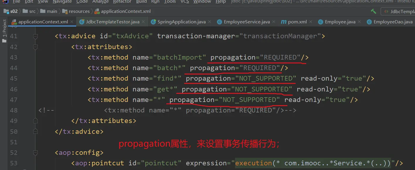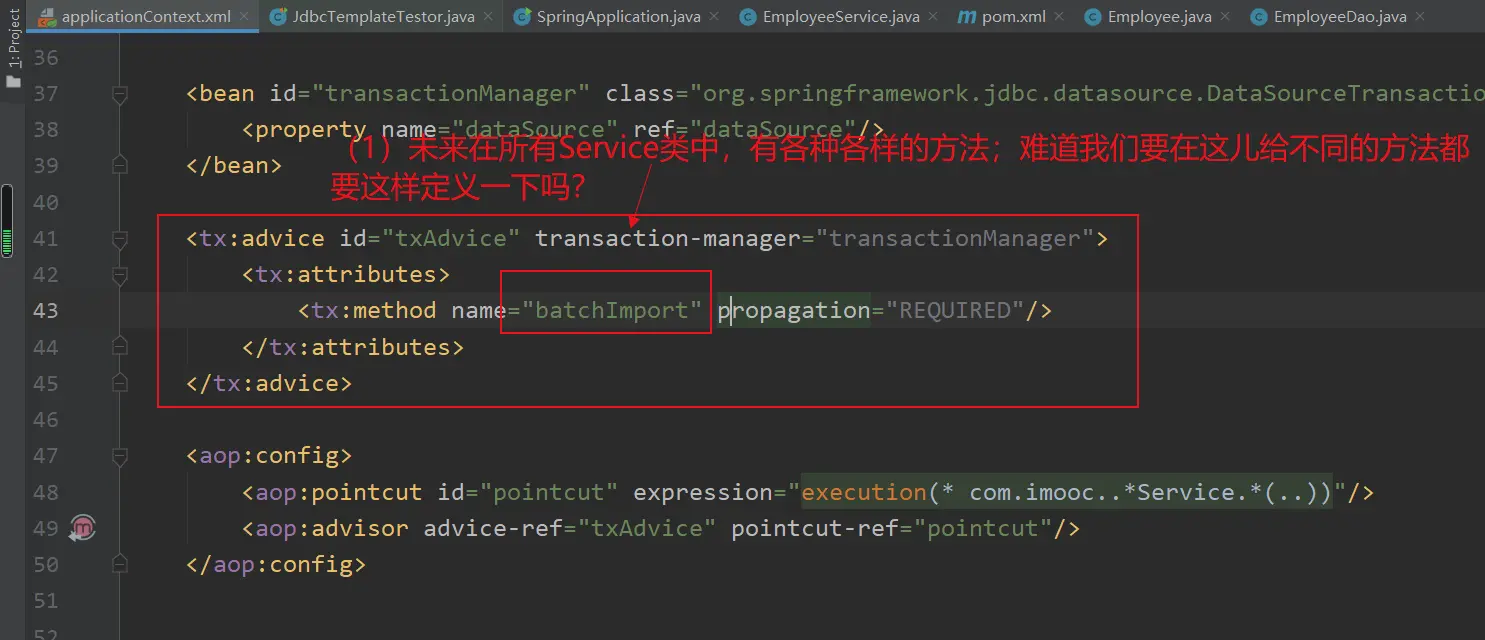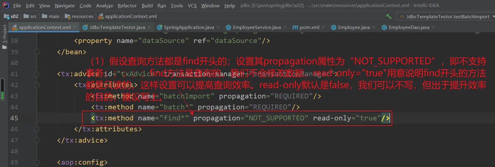 (3)在IoC容器中配置BatchService对象;在EmployeeService对象中注入BatchService对象;设置BatchService两个方法的事务传播方式;