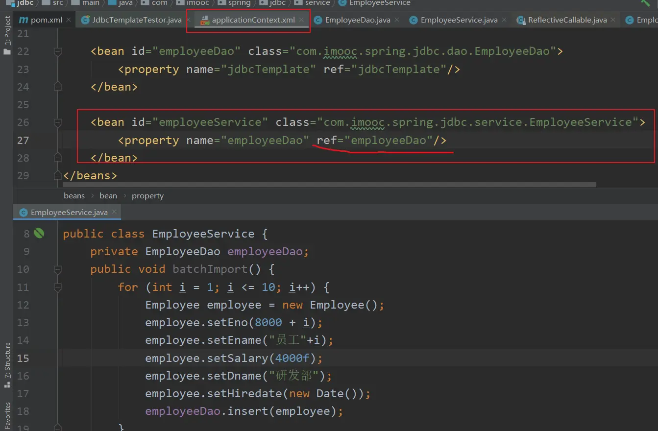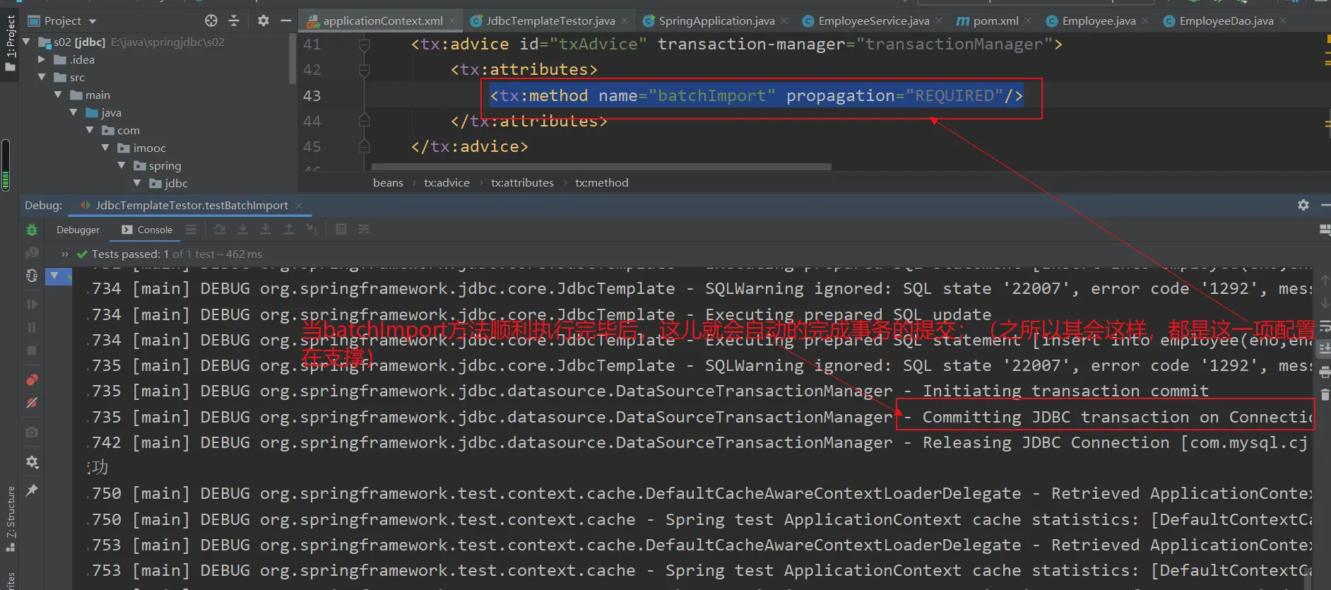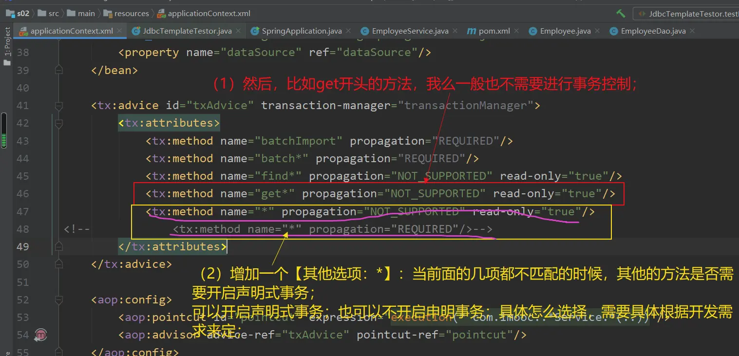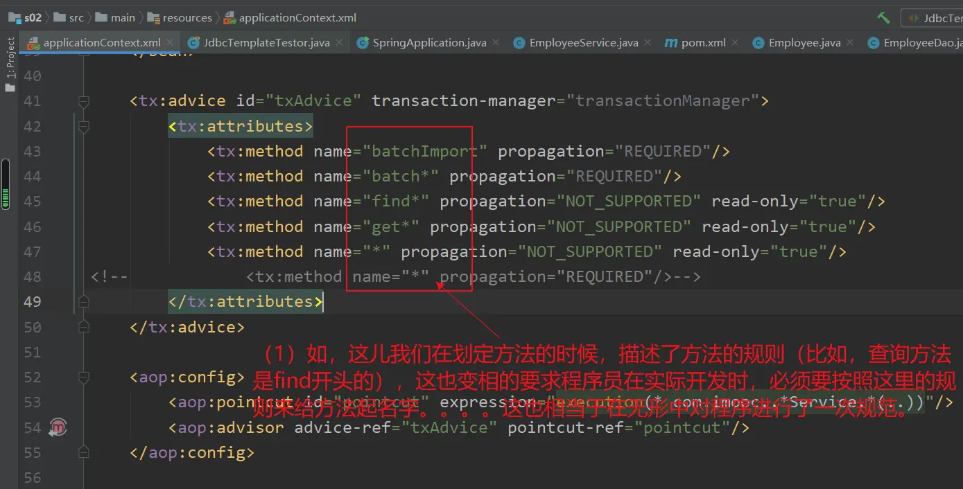 (3)在IoC容器中配置BatchService对象;在EmployeeService对象中注入BatchService对象;设置BatchService两个方法的事务传播方式;