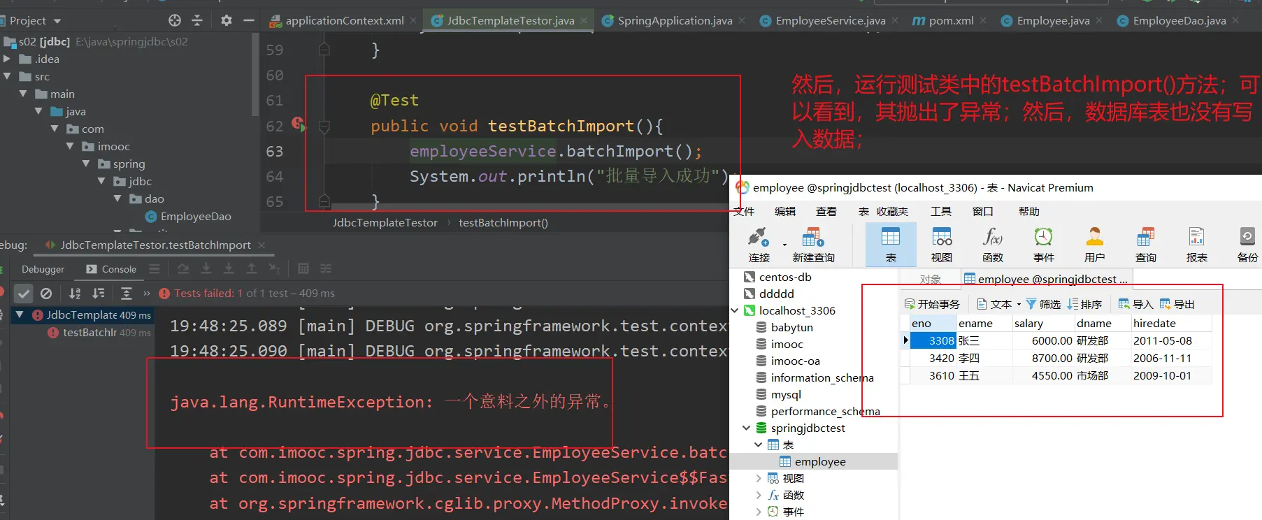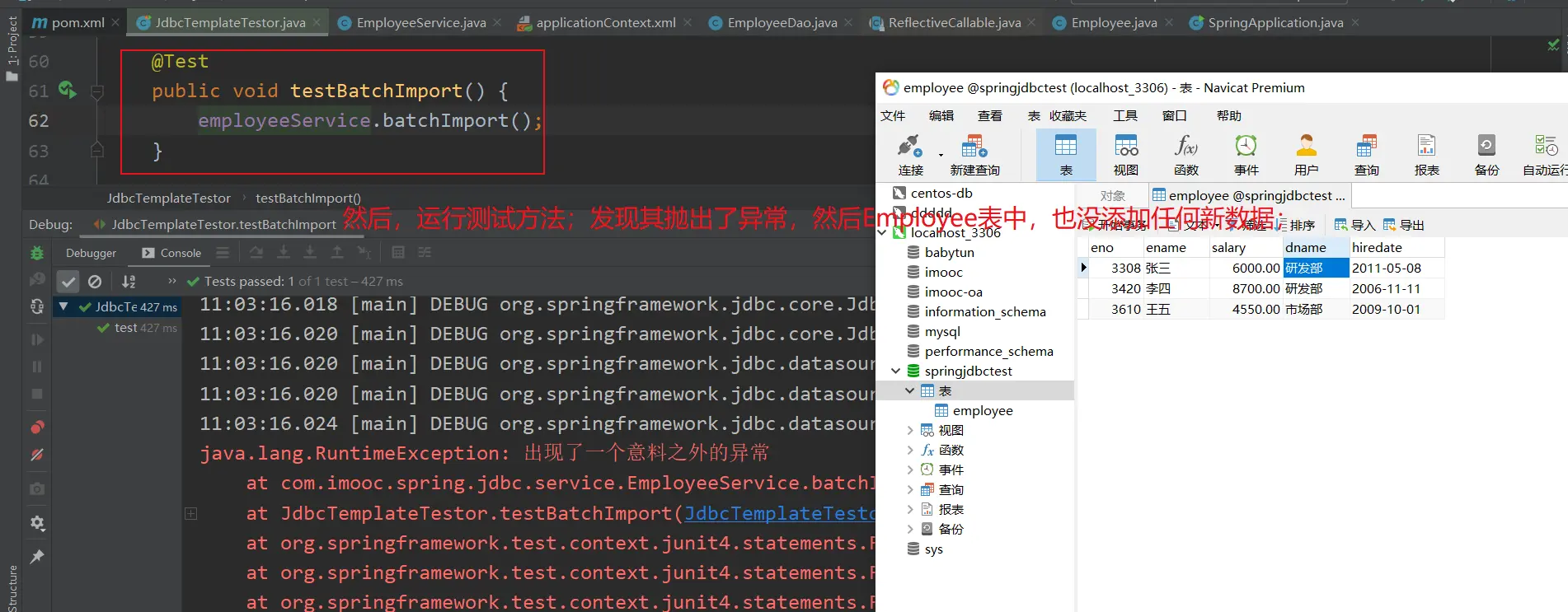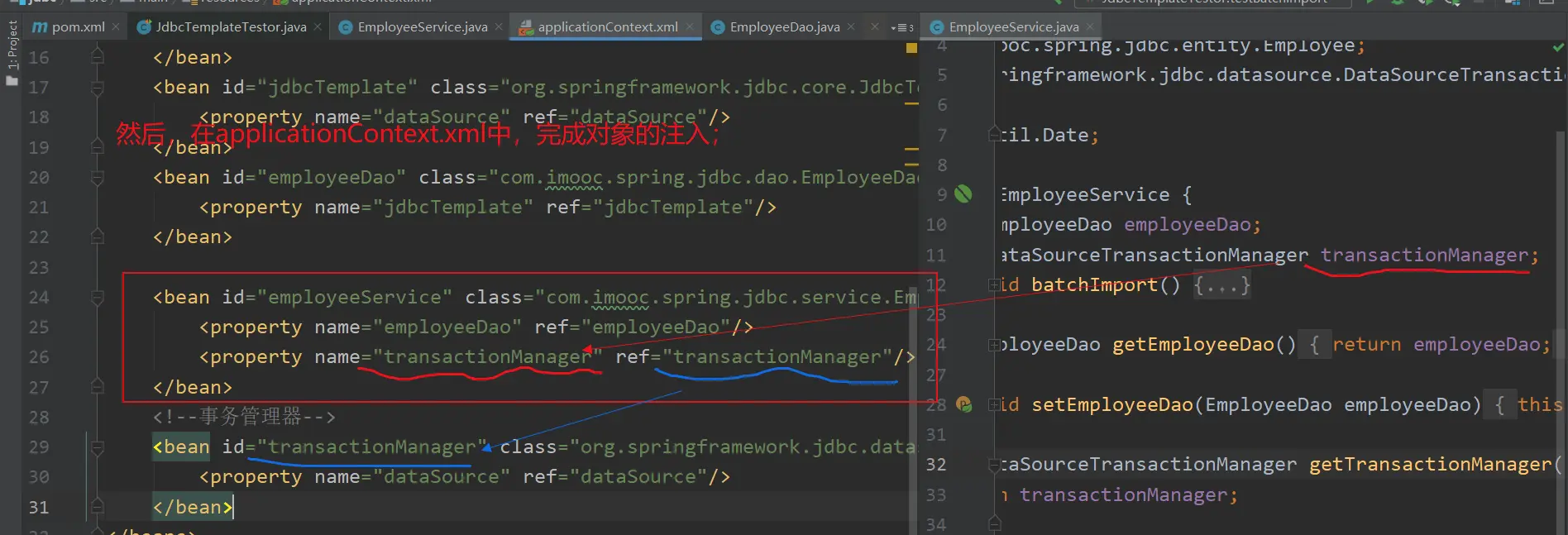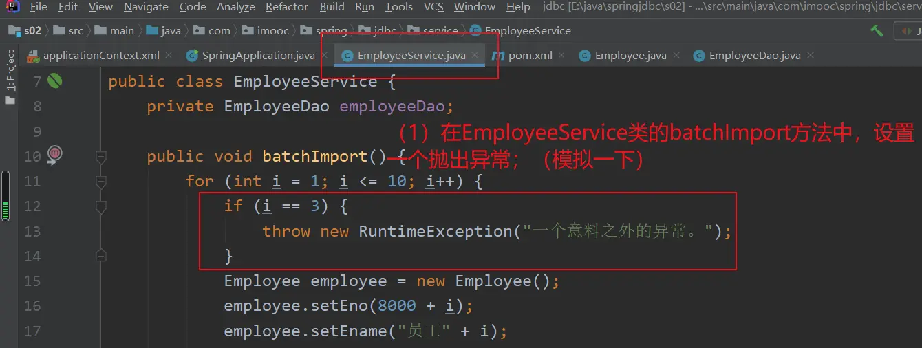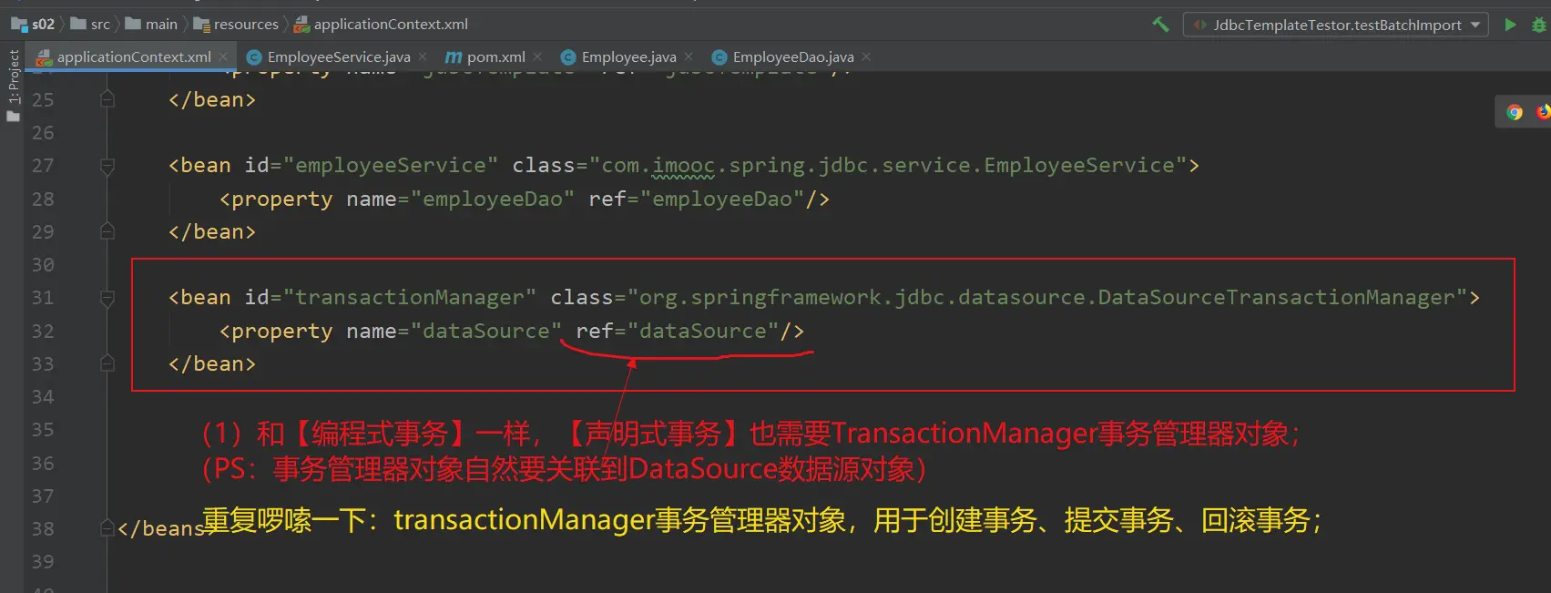 (3)在IoC容器中配置BatchService对象;在EmployeeService对象中注入BatchService对象;设置BatchService两个方法的事务传播方式;