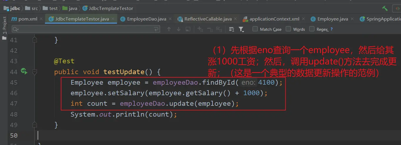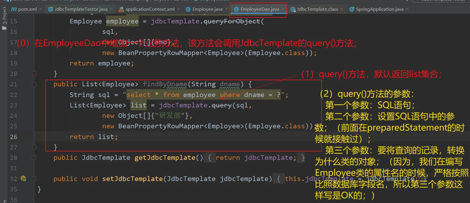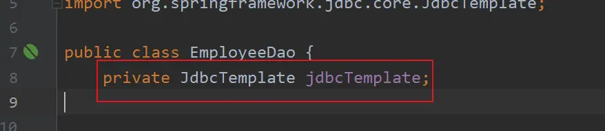 ●在需要增删改查的Dao类中,去持有JdbcTemplate属性,并为其设置get和set方法(之所以设置get和set方法,是因为后面我们在依赖注入的时候是采用【使用XML方式实现Spring】中的策略来做的);然后,在Dao类的具体增删改查业务代码中,调用JdbcTemplate相应的方法,完成相应的增删改查操作;