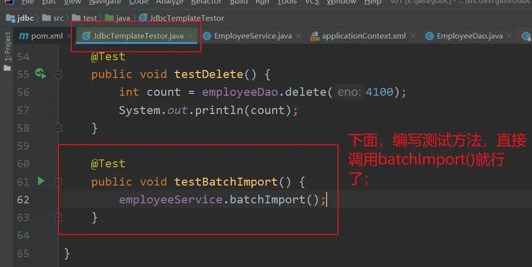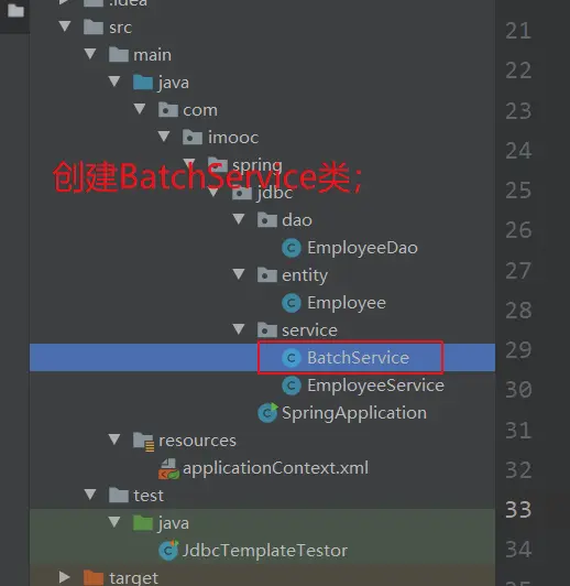 (5)BatchService:一个简单的Service类;使用注解配置了声明式事务;