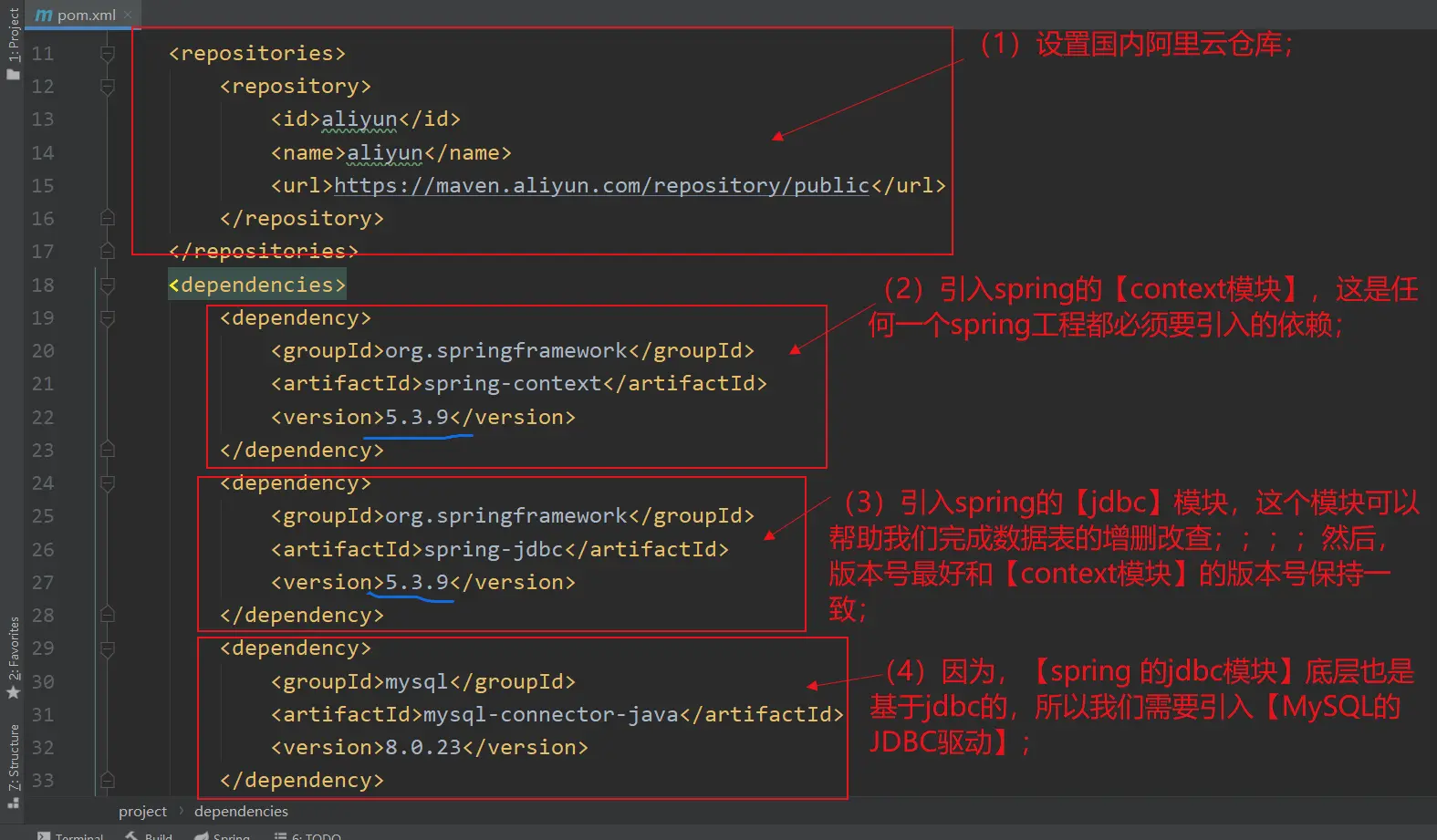 ● 在pom.xml中引入【Spring Context模块】,【Spring JDBC模块】,【Mysql的JDBC驱动依赖】;
