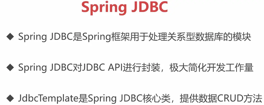 (1) 原生的JDBC操作起来比较麻烦,比如必须使用繁琐的语句完成查询,必须要时刻留意是否关闭了数据库连接等;Spring公司,就在其Spring框架中,添加了【Spring JDBC】模块,来解决这个问题;