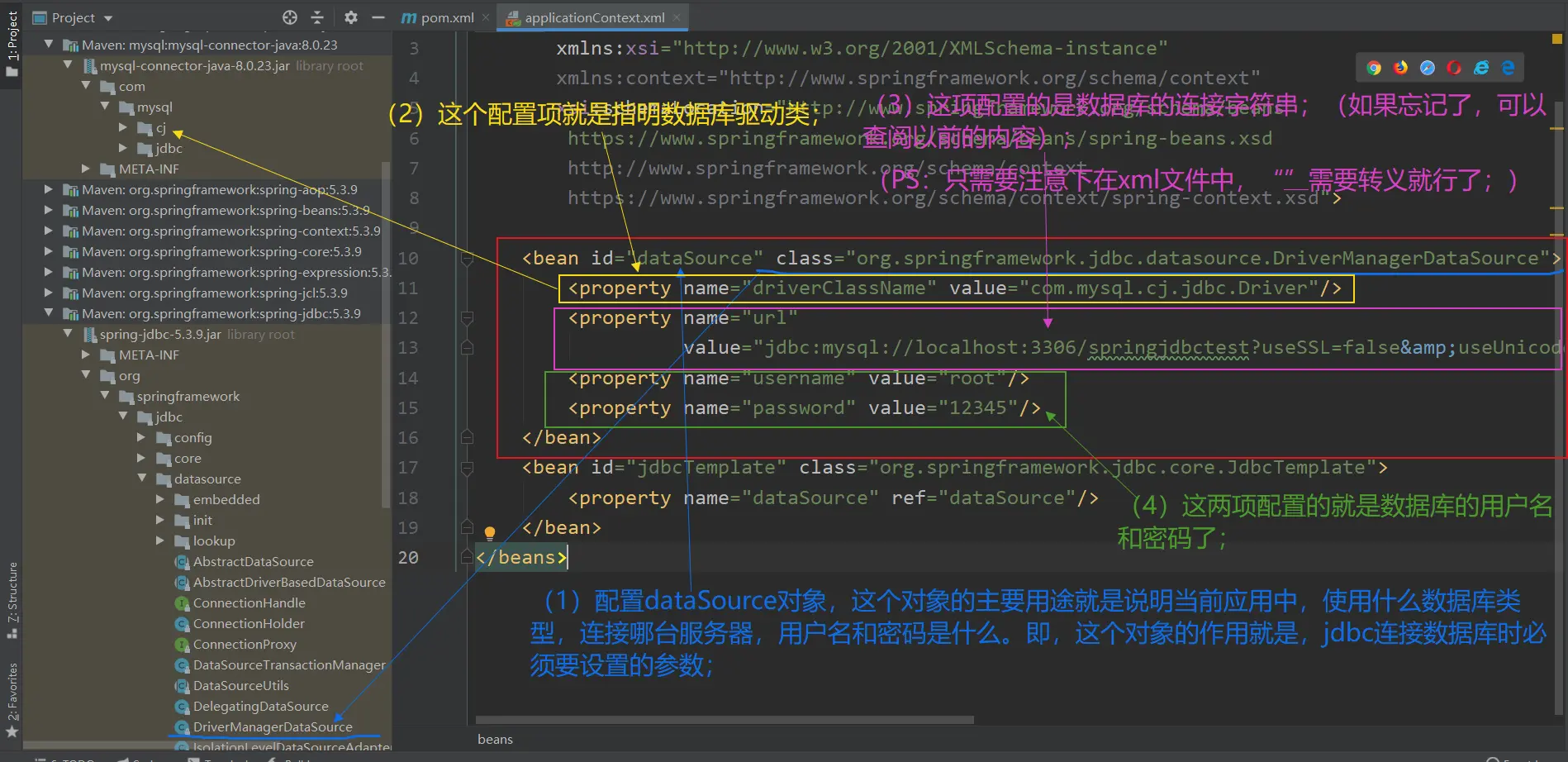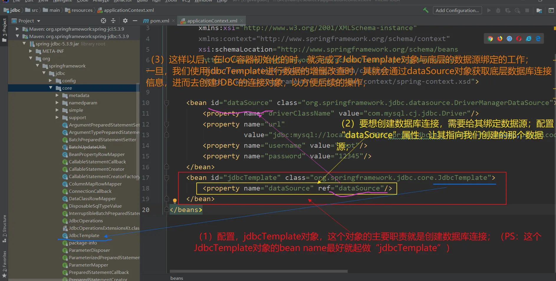 ●在applicationContext.xml中配置dataSource数据源对象,jdbcTemplate对象;(这样一来,IoC容器初始化时,就能实例化JdbcTemplate)