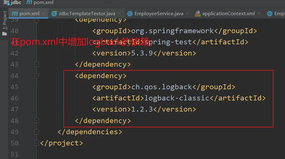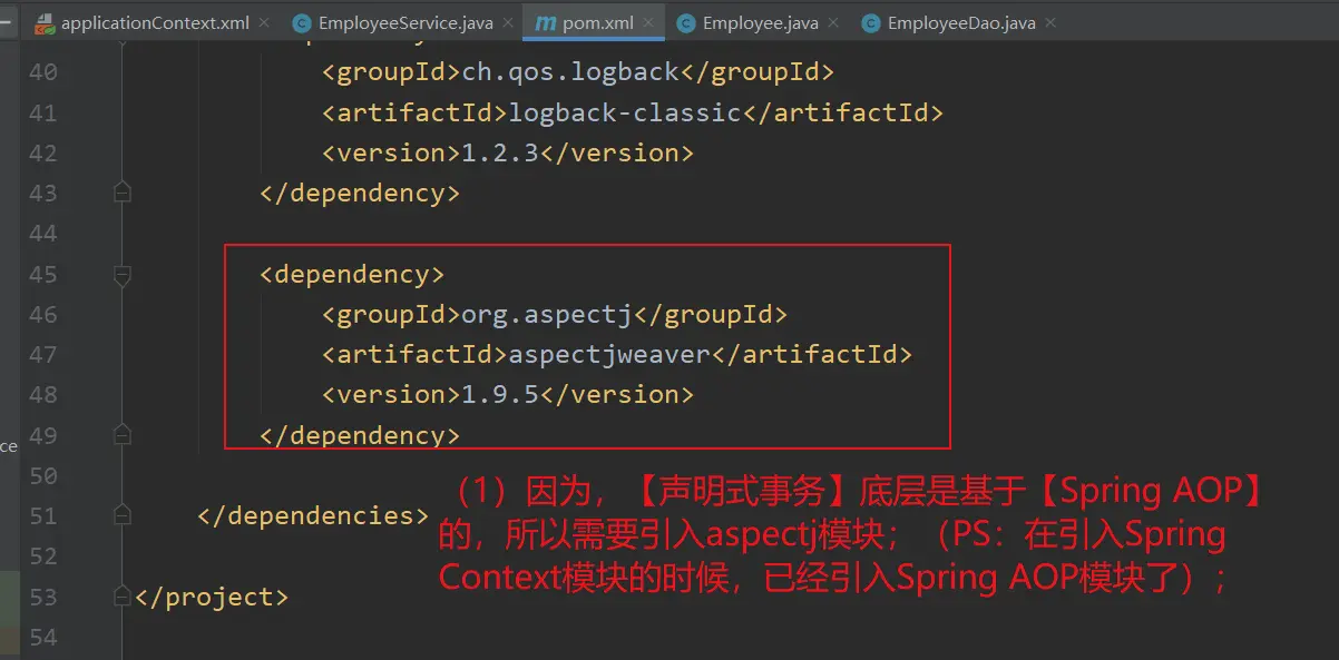 (1) 没什么好说的,目前在pom.xml中,引入了【Spring Context模块】,【Spring JDBC模块】,【MySQL JDBC驱动】,【junit测试依赖】,【Spring Test模块】,【logback日志依赖】,【Spring AOP底层依赖的aspectjweaver】这几个;