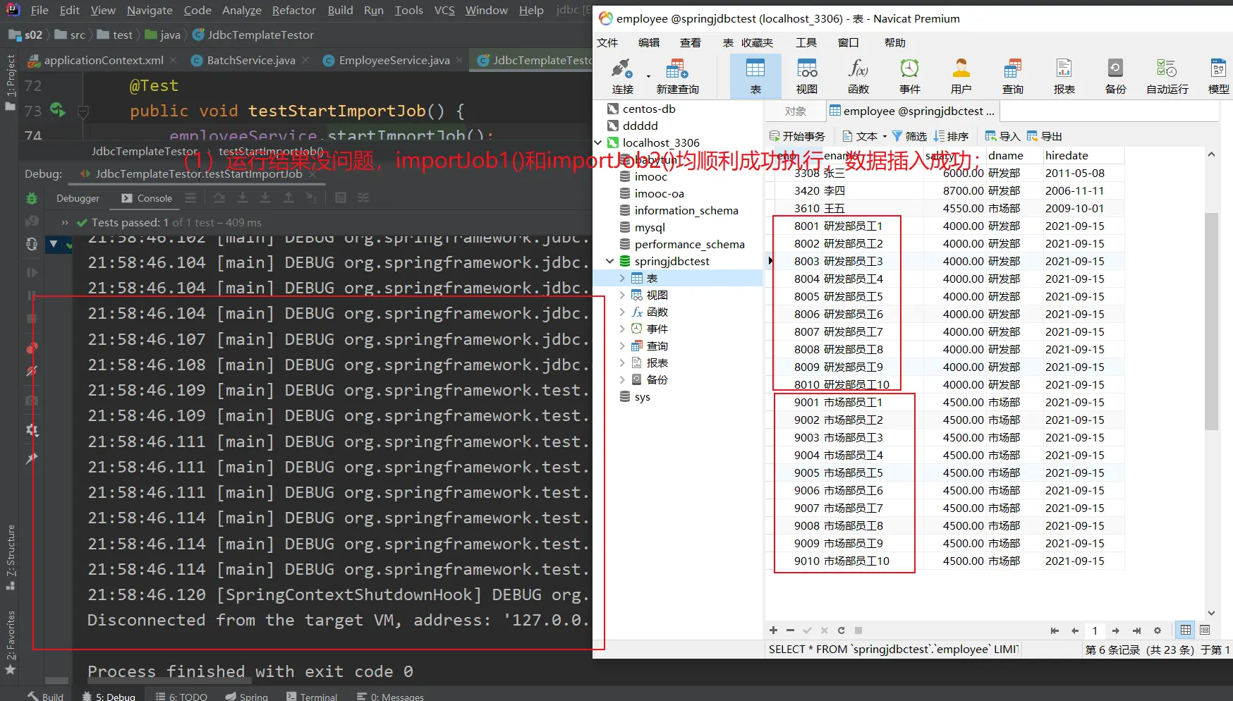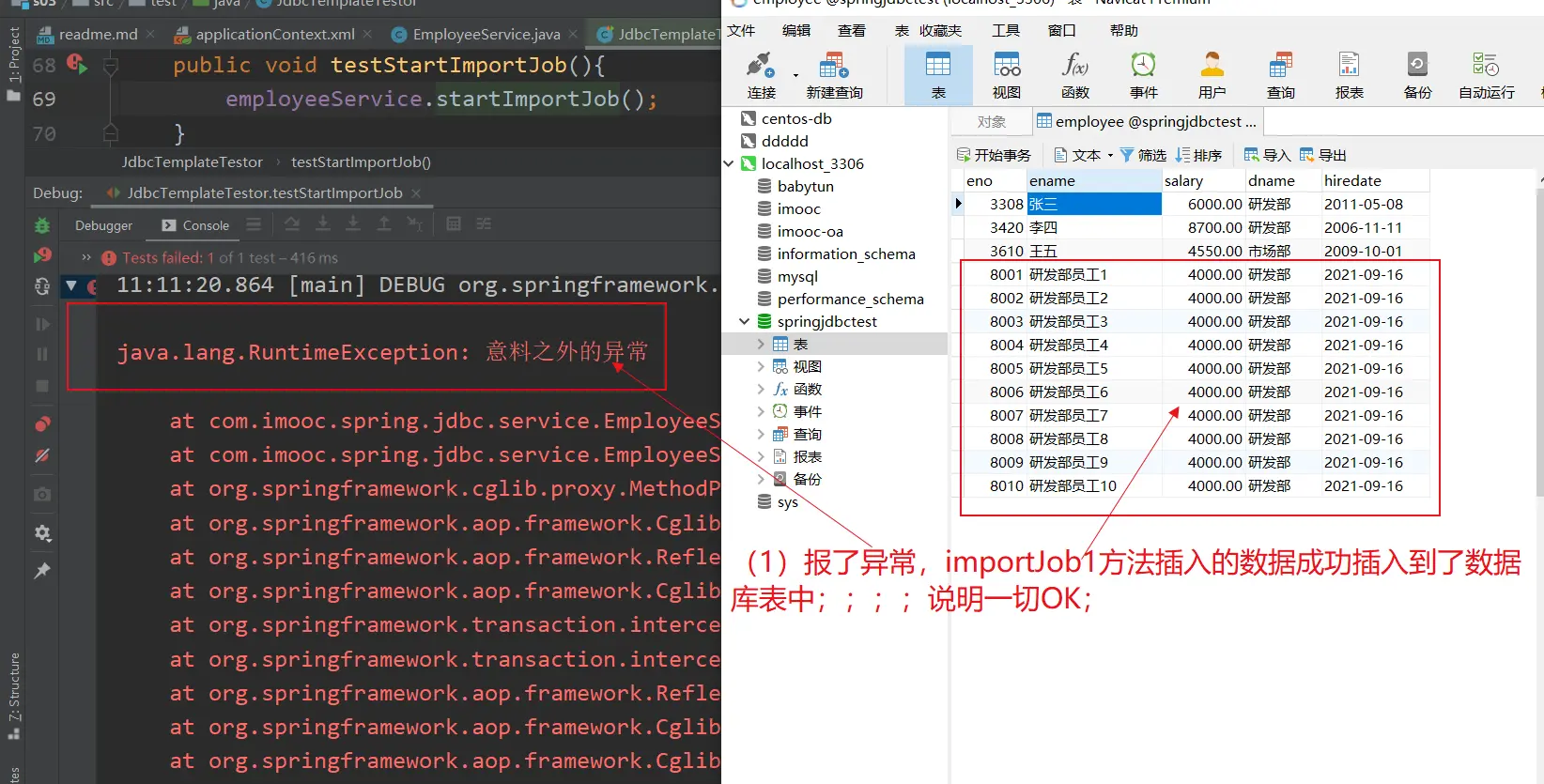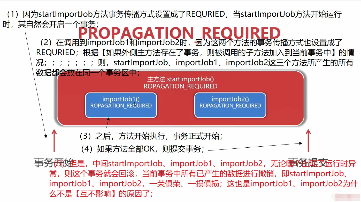 即可以发现,importJob1()、importJob2(),startImportJob()三个方法是嵌套调用的;然后,三个方法的事务传播方式均设置成了“REQURIED”;此时,通过运行结果可以发现,importJob1()、importJob2()是一荣俱荣、一损俱损的,二者并没有做到互不影响;