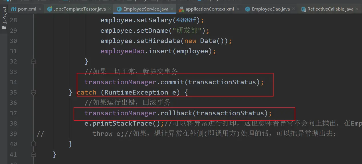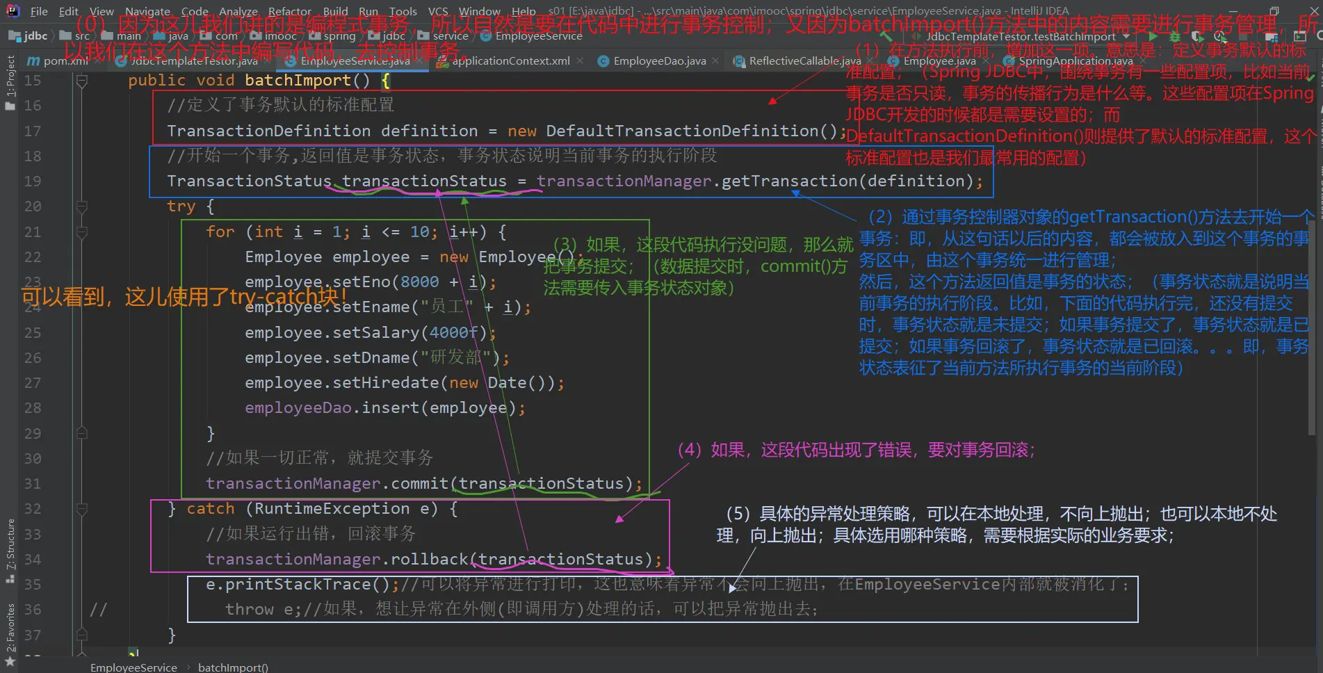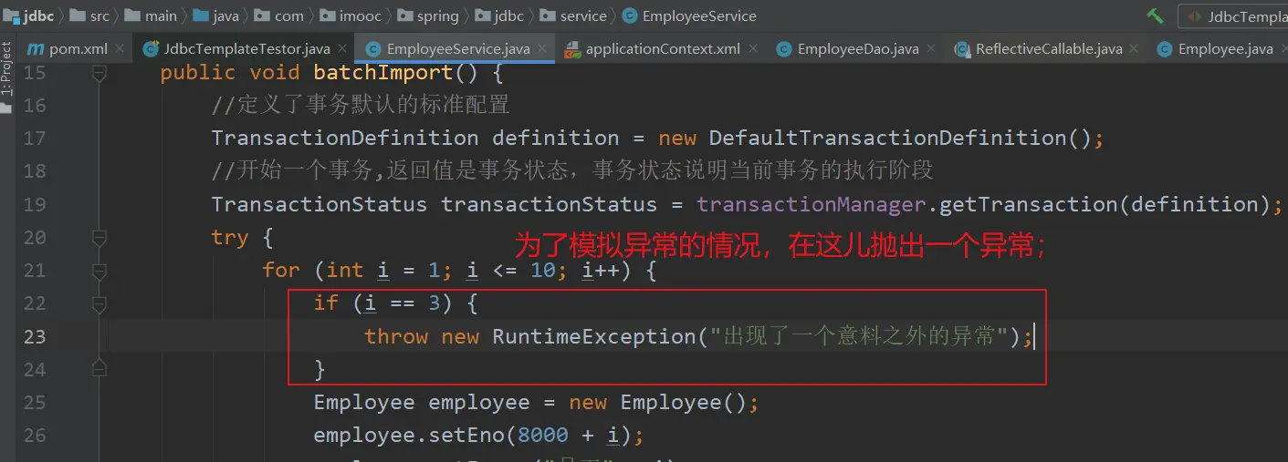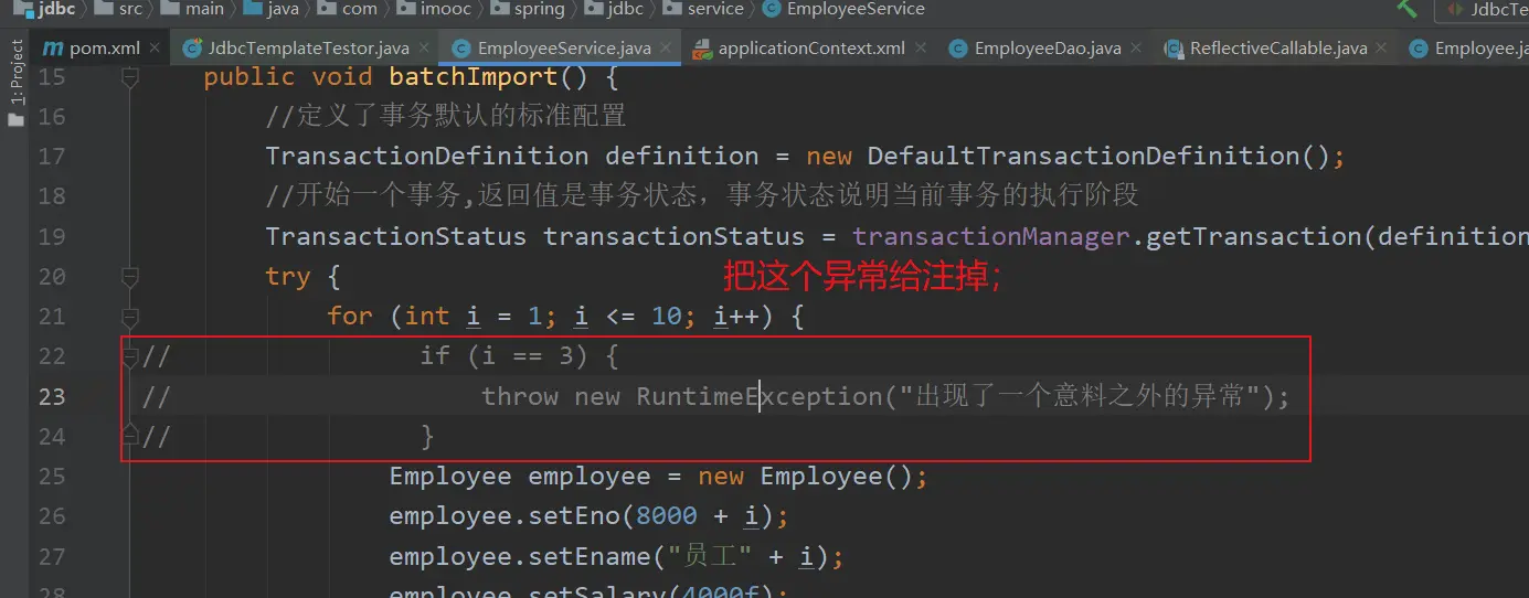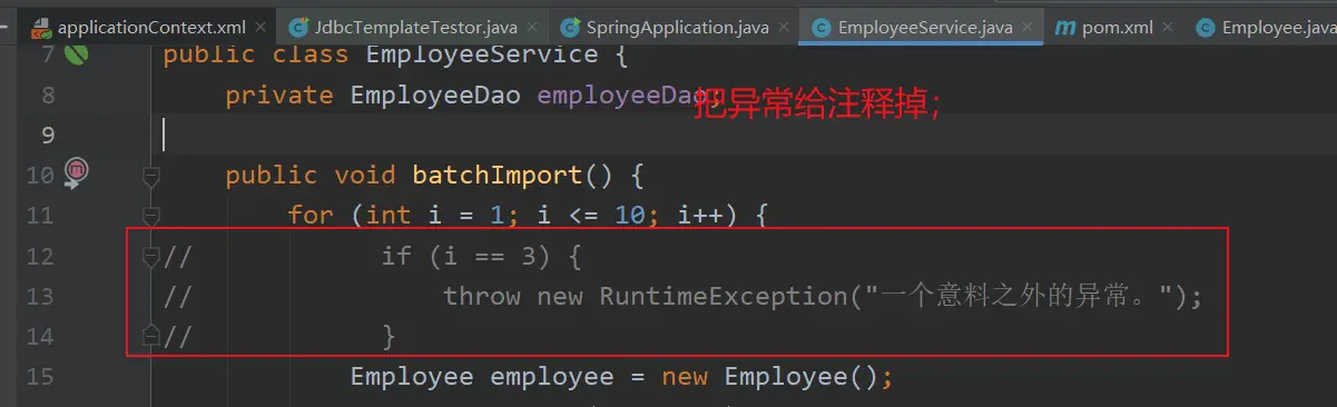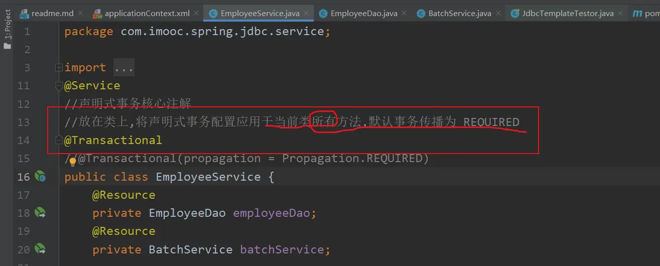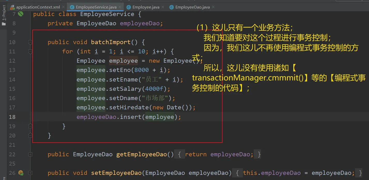 (4)EmployeeService:一个简单的Service类;使用注解配置了声明式事务;