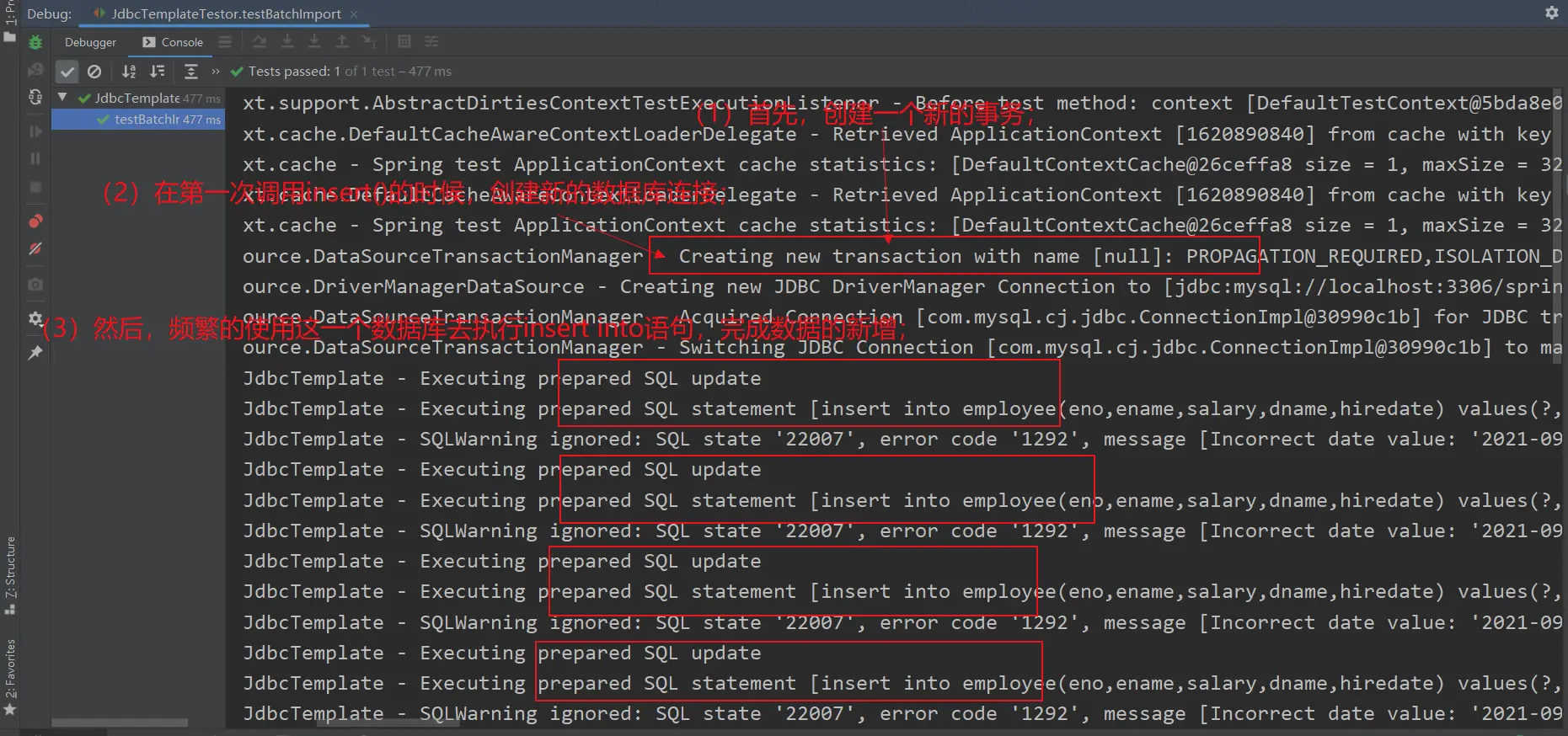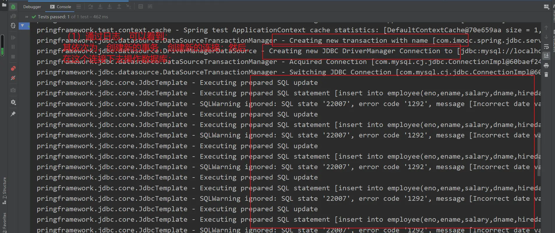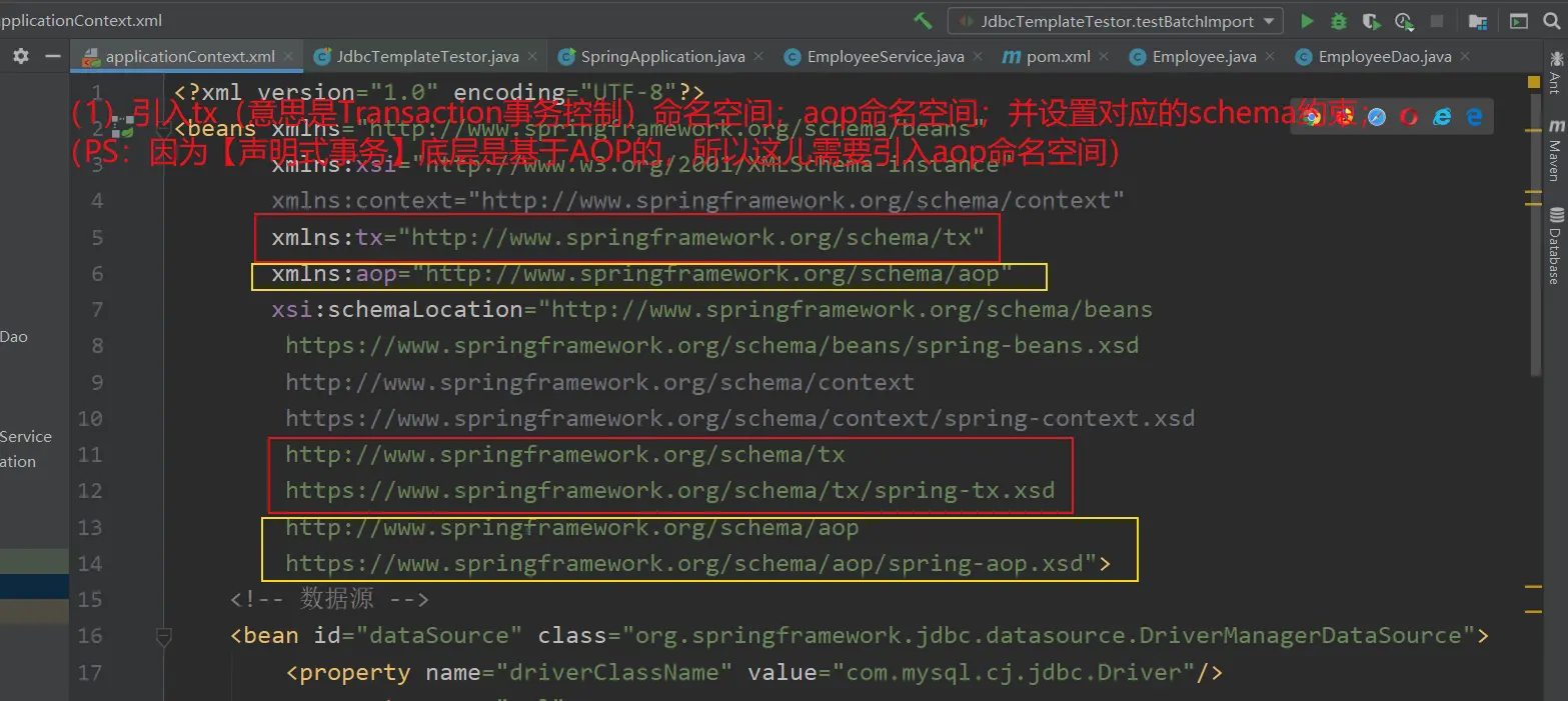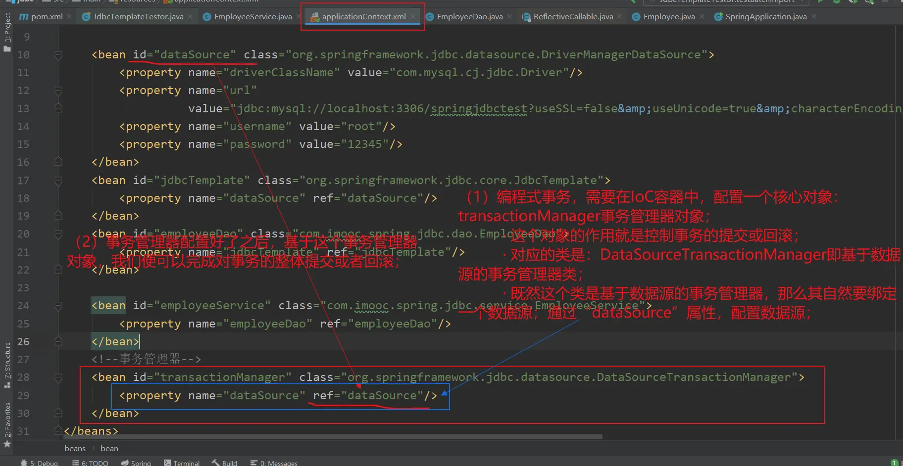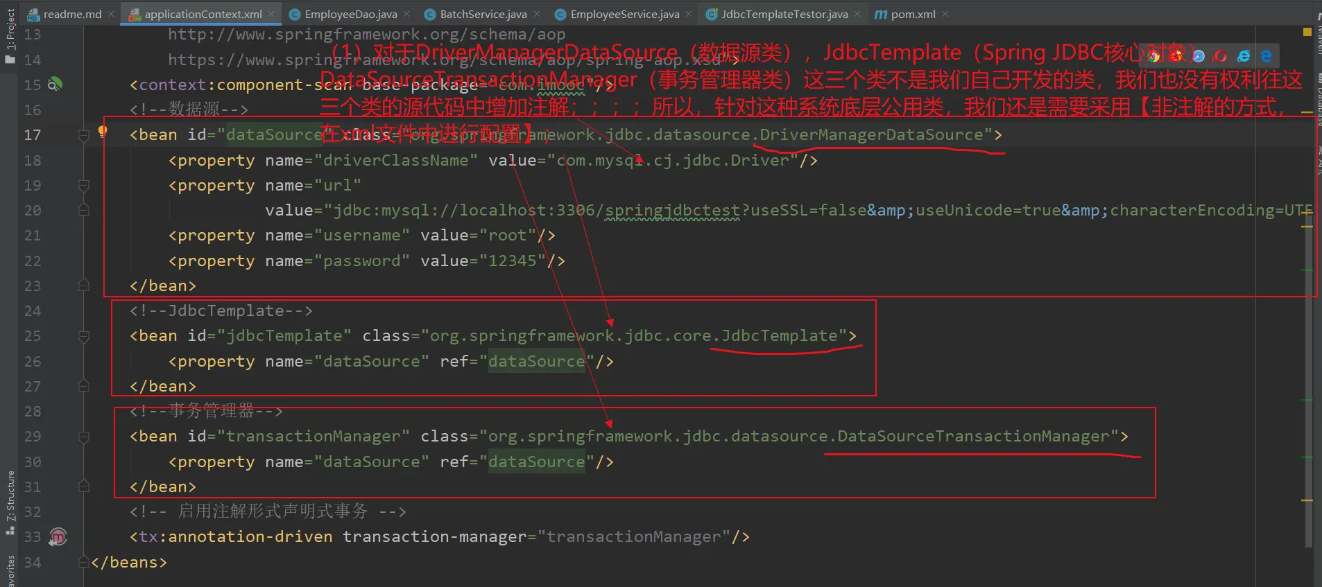 (2) 即使我们这儿是使用注解方式配置声明式事务;但是,DriverManagerDataSource数据源类,JdbcTemplate核心类,DataSourceTransactionManager事务管理器类这三个系统底层的公用类,还是需要采用XML方式进行配置;