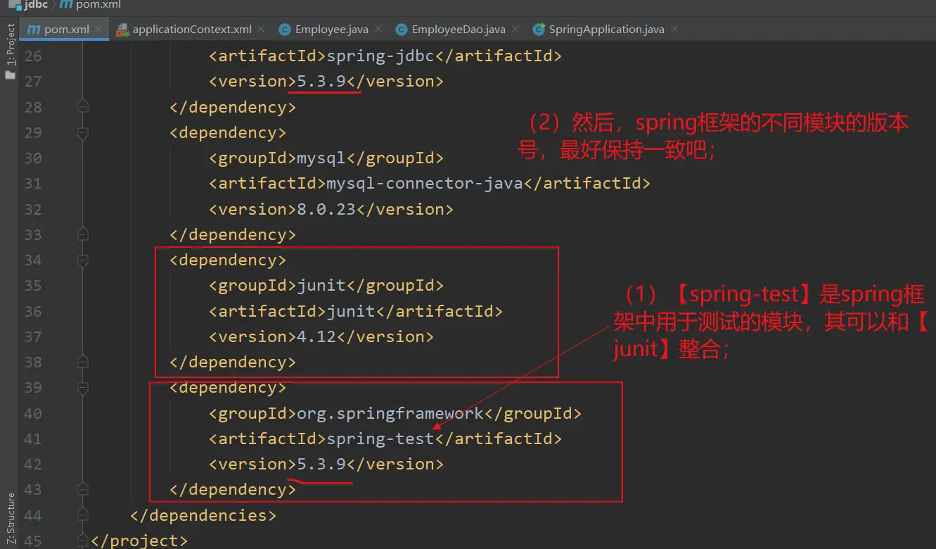 (1)主要引入了三个依赖: 【Spring Context模块】,【Spring JDBC模块】,【JDBC】;