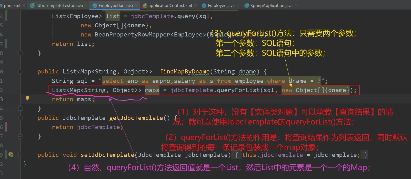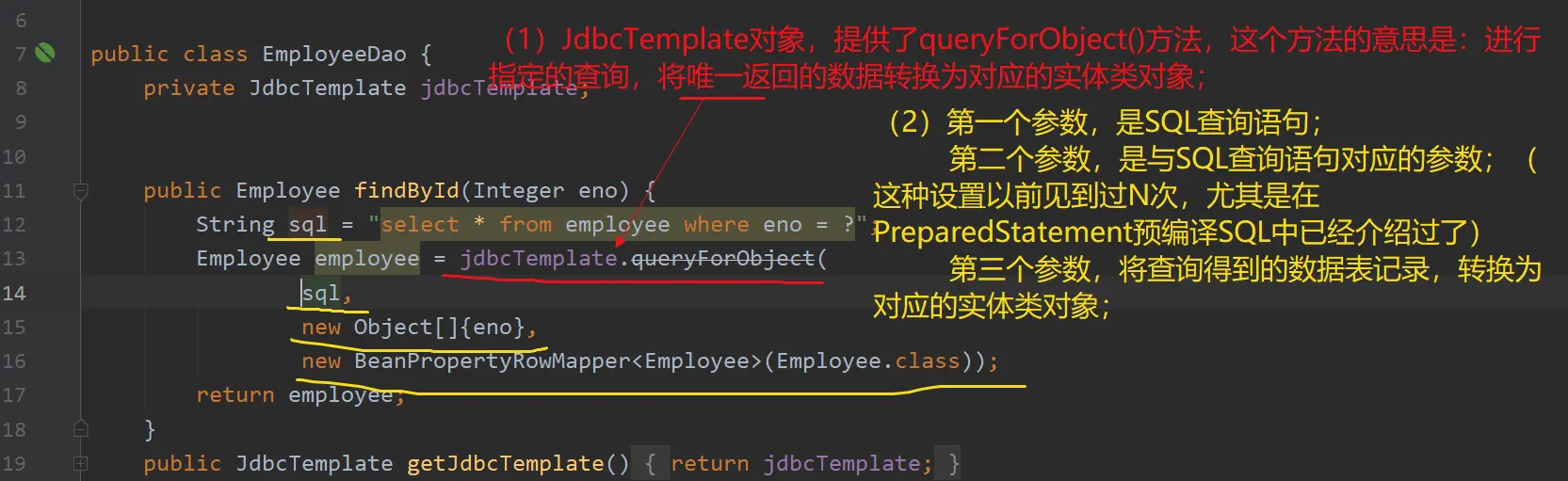 (2) 配置好之后,需要在Dao中初始化【JdbcTemplate对象】,并通过【JdbcTemplate对象】实现增删改查操作;