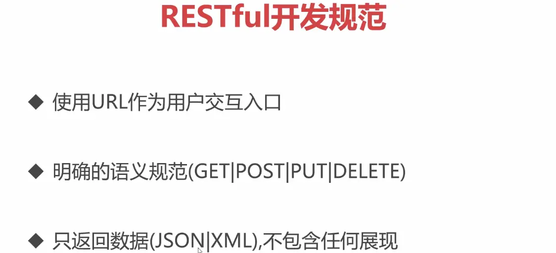 ● REST定义的语义规范:【GET:查询操作】【POST:新增操作】【PUT:更新操作】【DELETE:删除操作】;