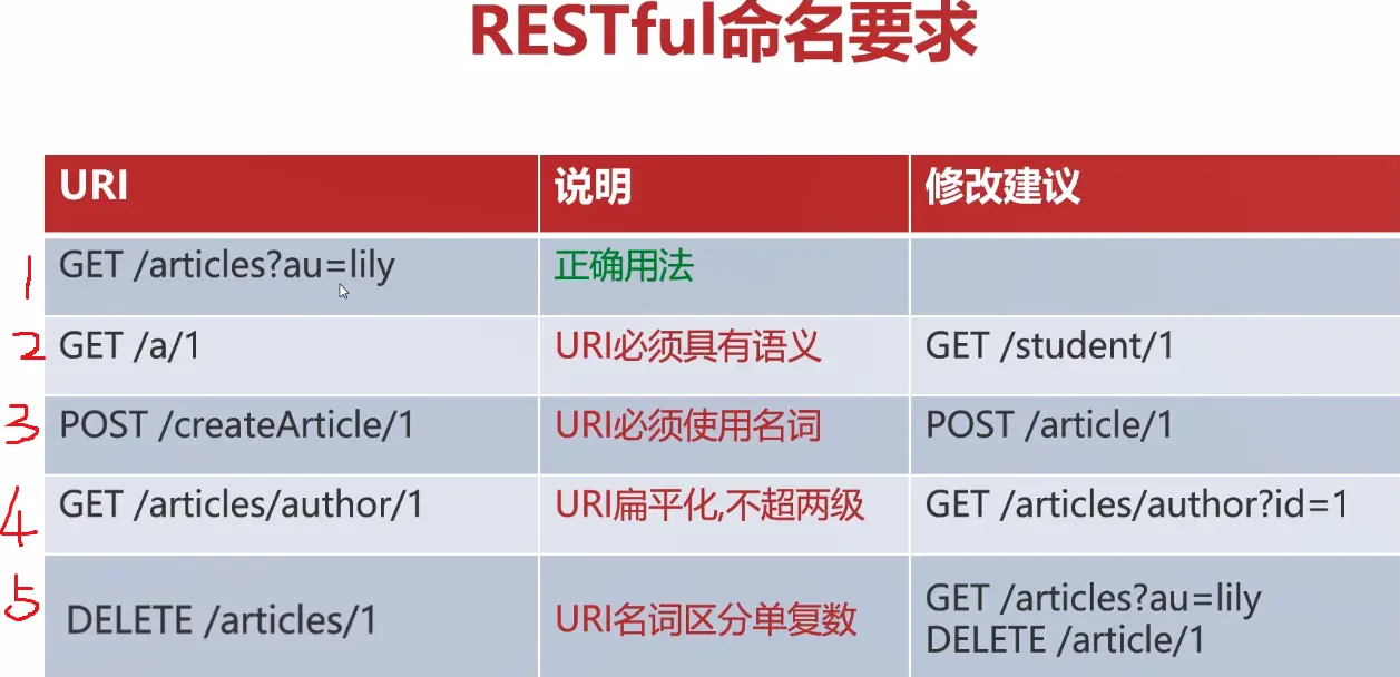 ● 这样做的好处:如前端看到后端给的uri是【GET/articles?au=lily】,那么前端工程师会知道后端返回的数据大概率是一个JSON数组;如前端看到后端给的uri是【GET/article?au=lily】,那么前端工程师会知道后端返回的数据大概率是单个JSON字符串;