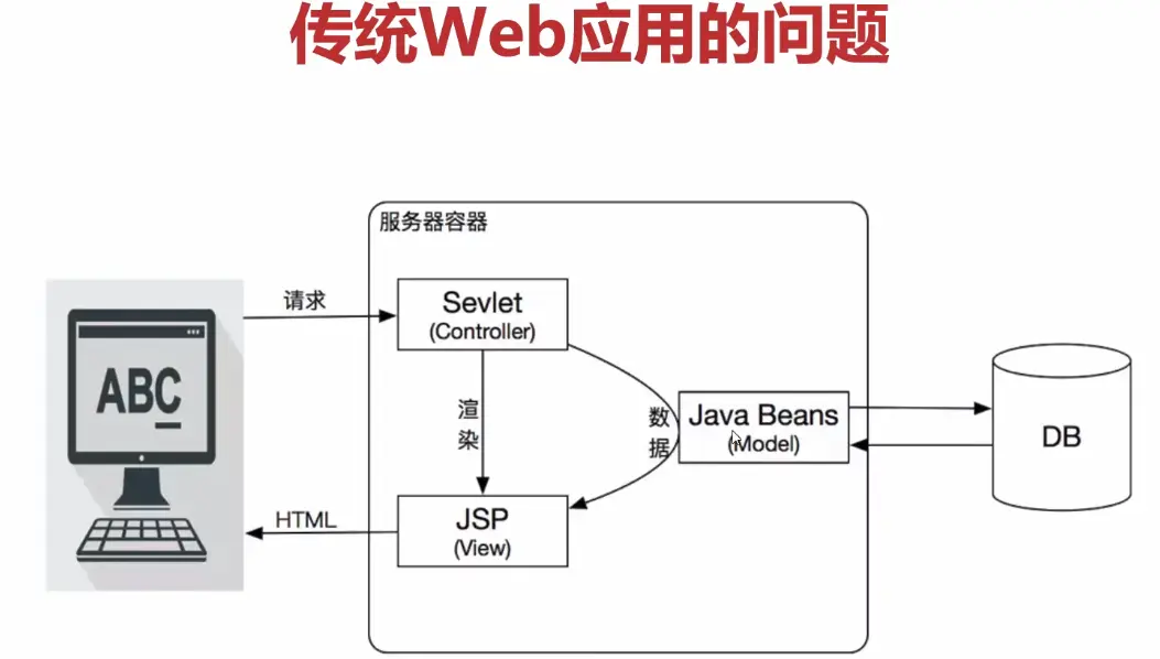 (1)传统的【基于MVC模式开发 web应用】:阐述: 上面的开发模式是典型的B/S架构(Browser/Server,浏览器/服务器模式);