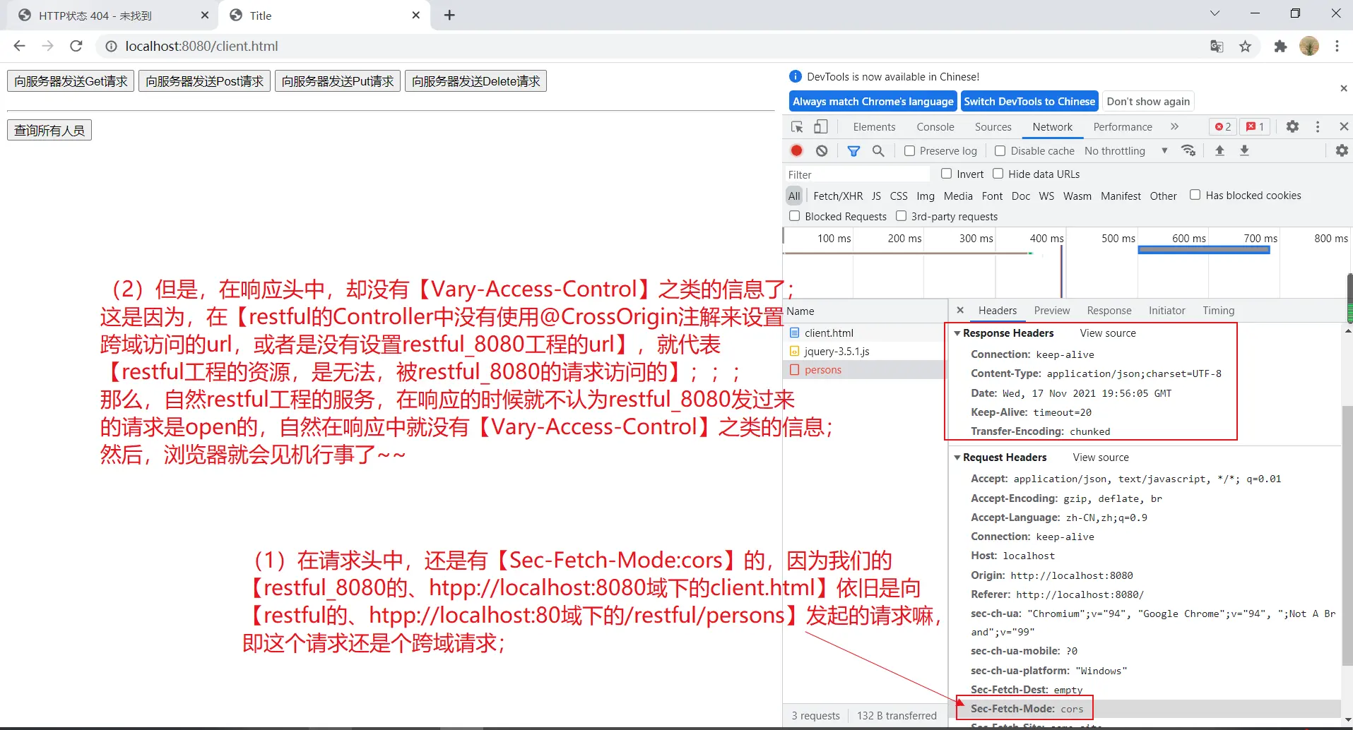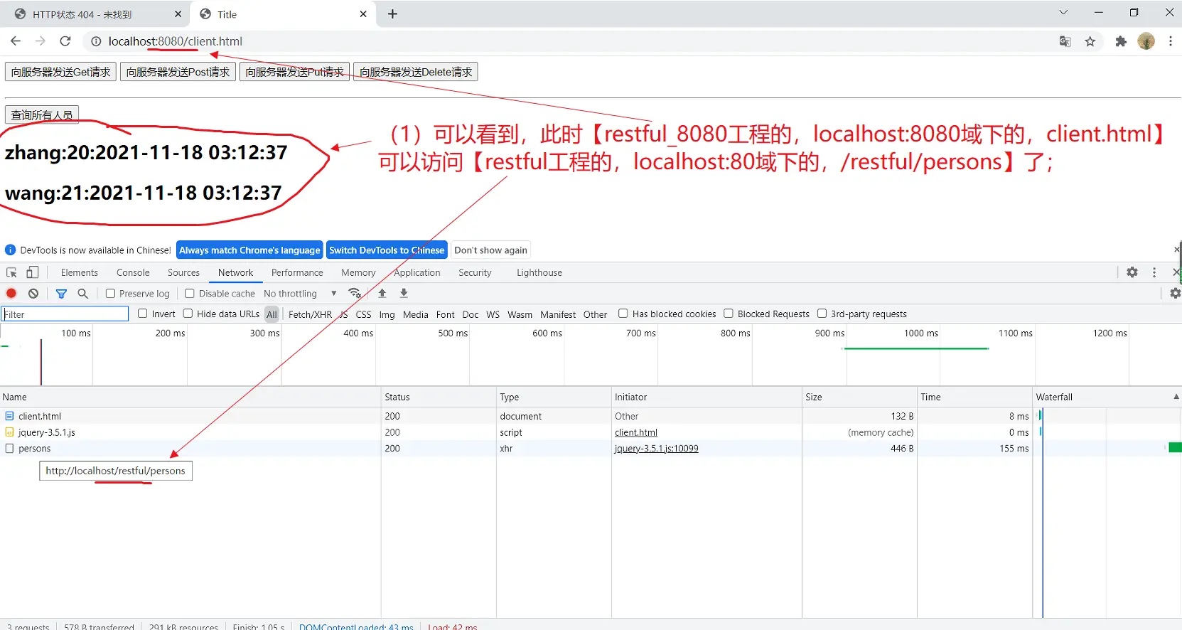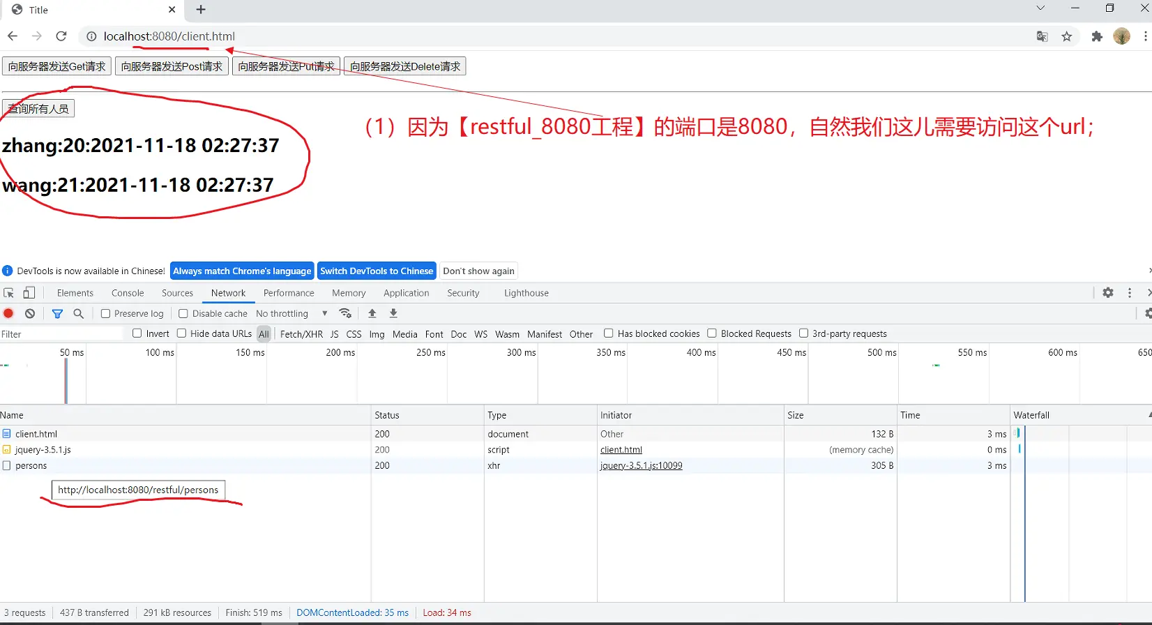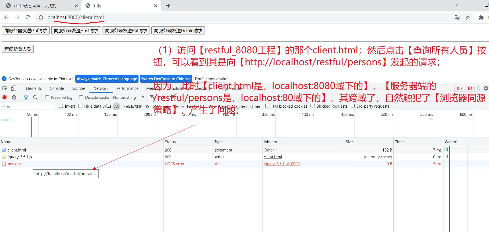 即,在上面的过程中【localhost:8080,下的client.html】访问【localhost:8080,下的/restful/persons】时,没有跨域,其自然是可以访问的;