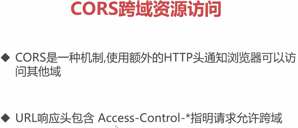 ● 这种机制是指:通过【在“HTTP请求”以及“响应头”的部分,附加一些额外的信息】,以通知浏览器可以访问其他域的资源;(自然,这些其他域的资源,在对应域名下也得是允许被访问的)