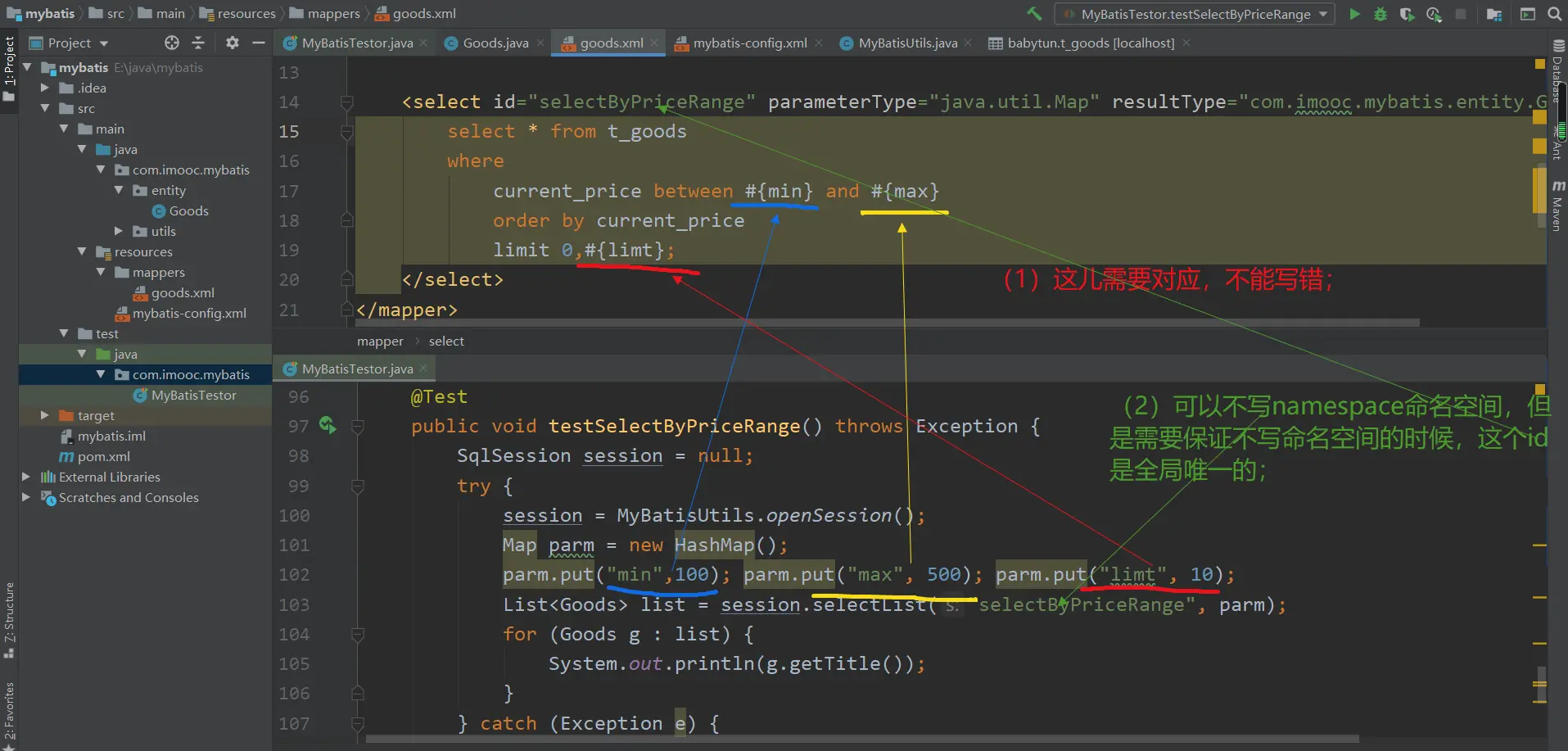 <select id="selectByPriceRange" parameterType="java.util.Map" resultType="com.imooc.mybatis.entity.Goods">