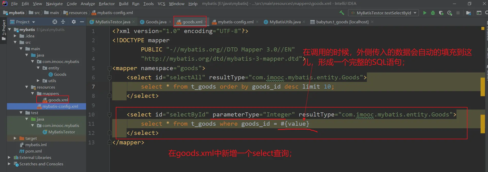 <select id="selectAll" resultType="com.imooc.mybatis.entity.Goods">