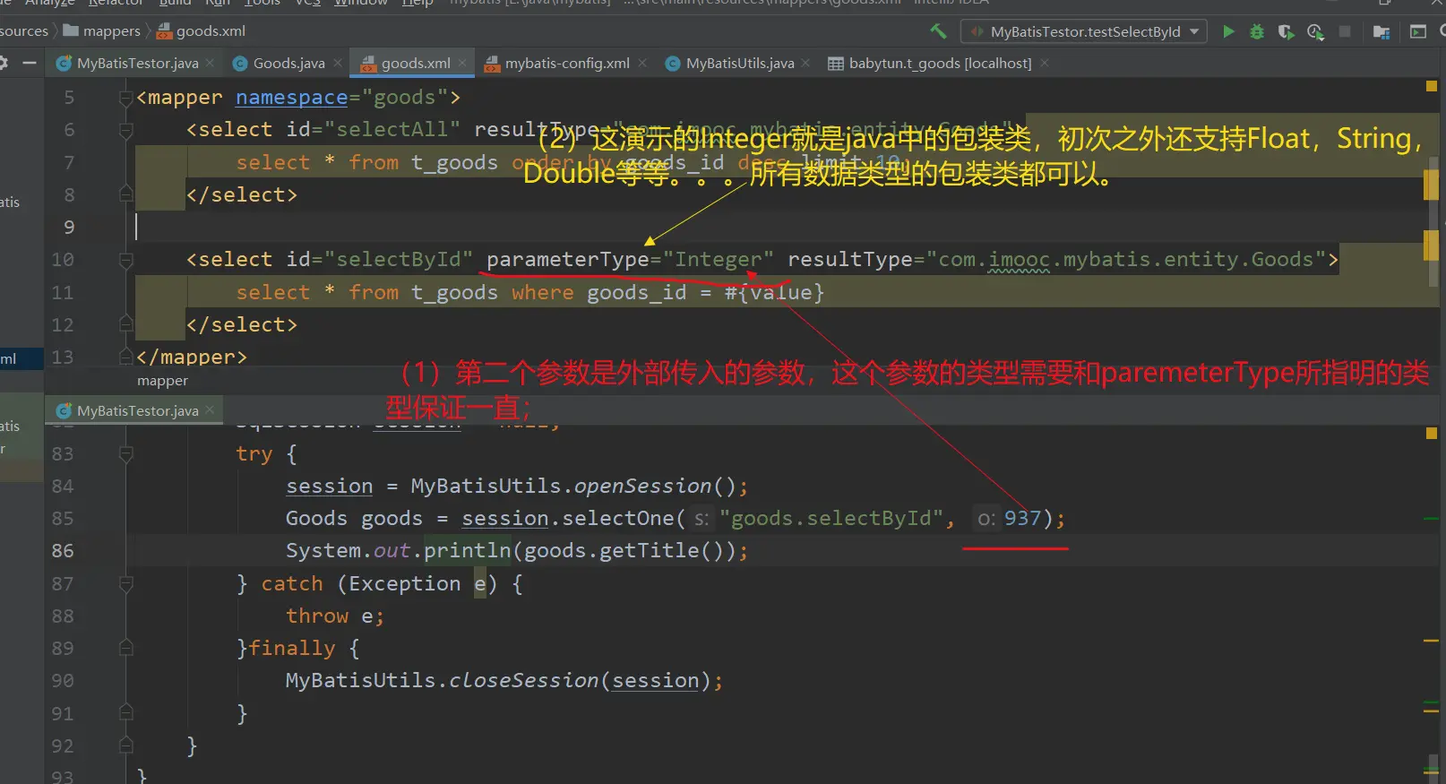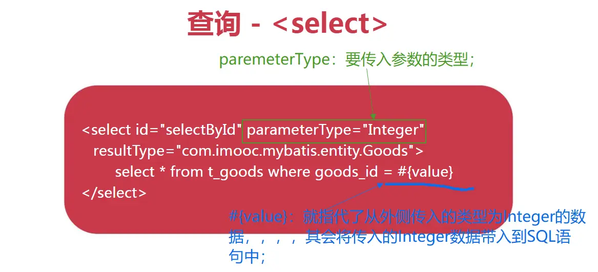 <select id="selectById" parameterType="Integer" resultType="com.imooc.mybatis.entity.Goods">