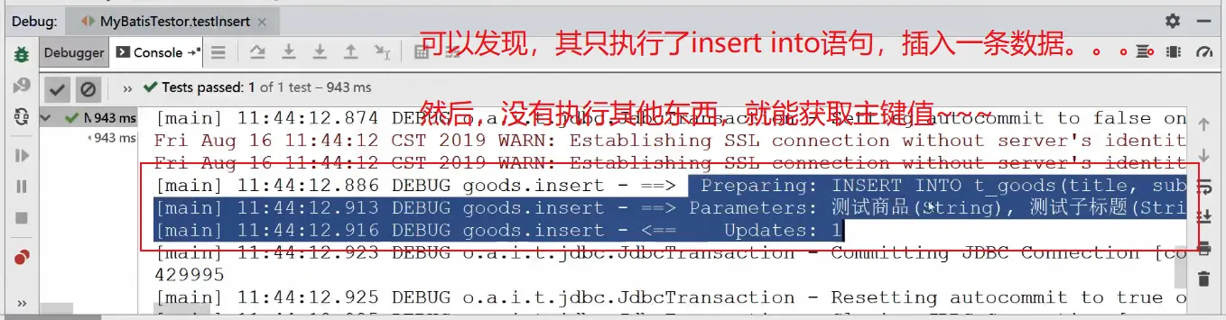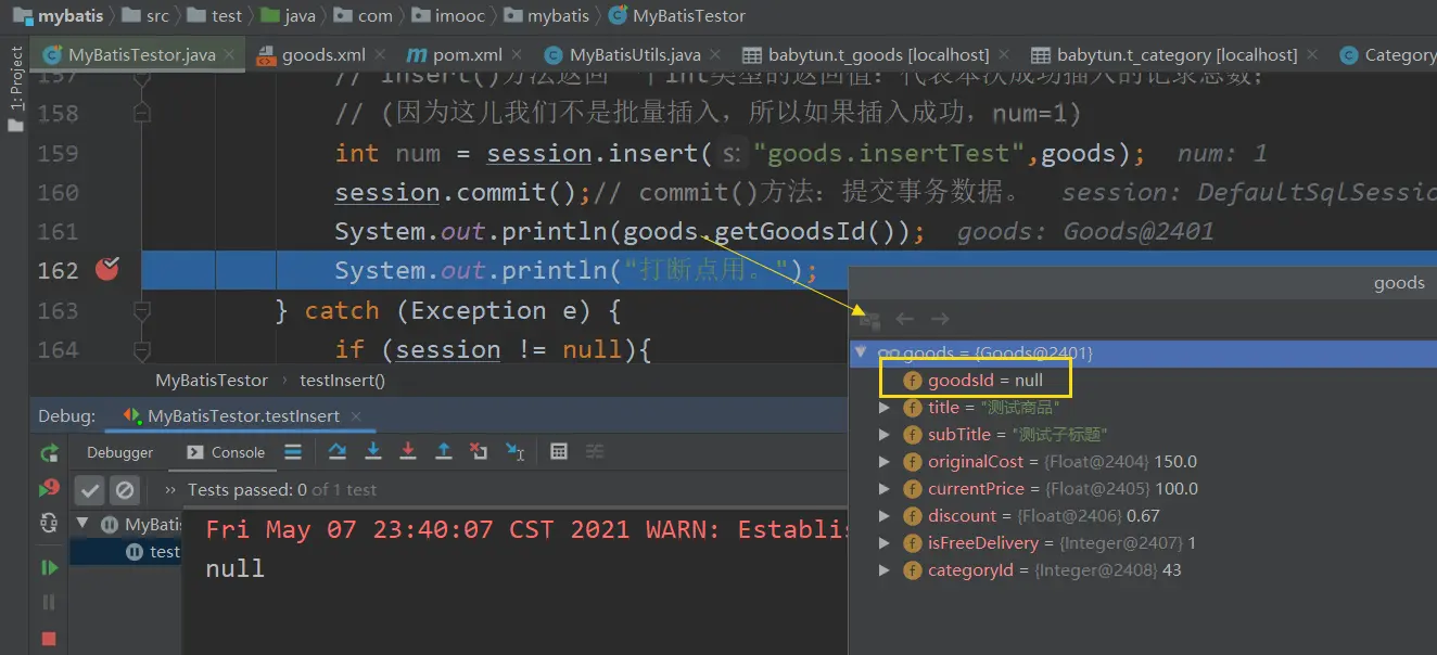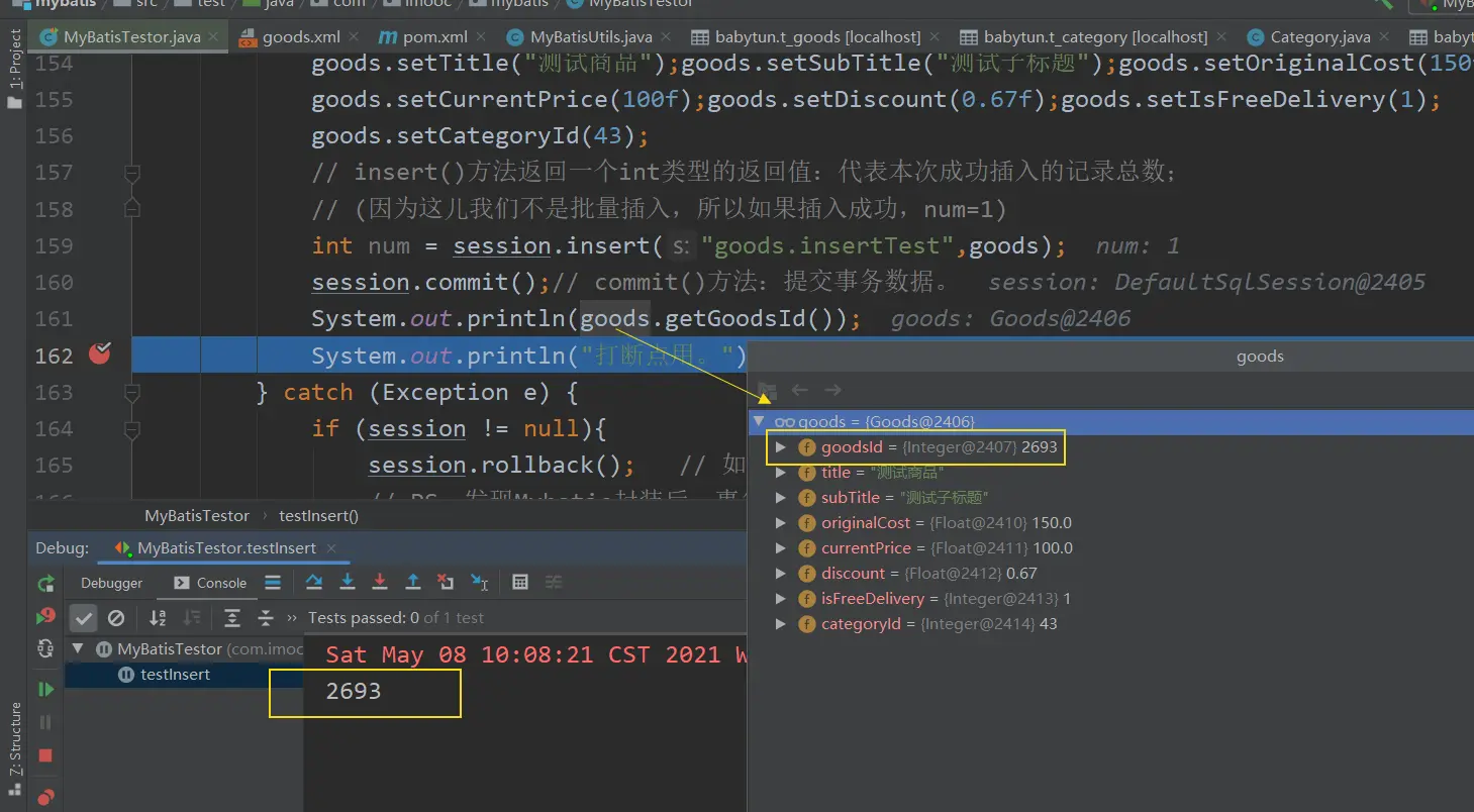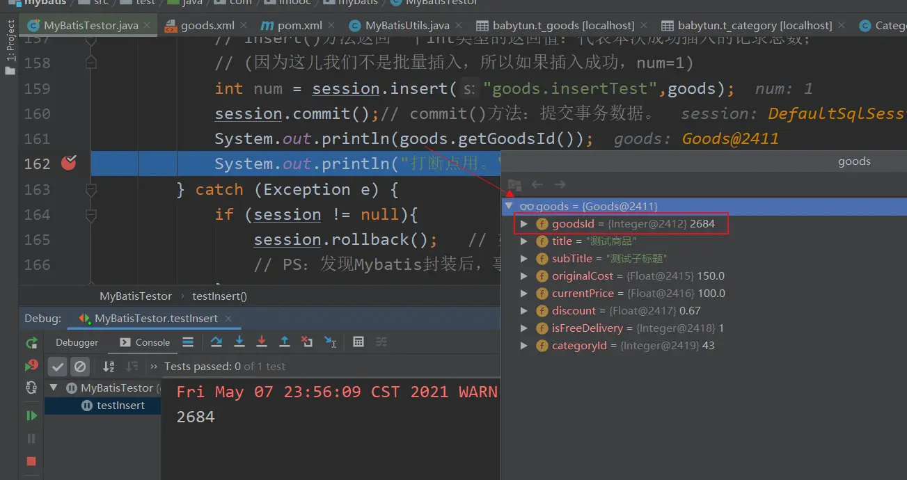 运行结果:新生成的主键值goods_id被回填到了Goods对象的goodsId属性中。