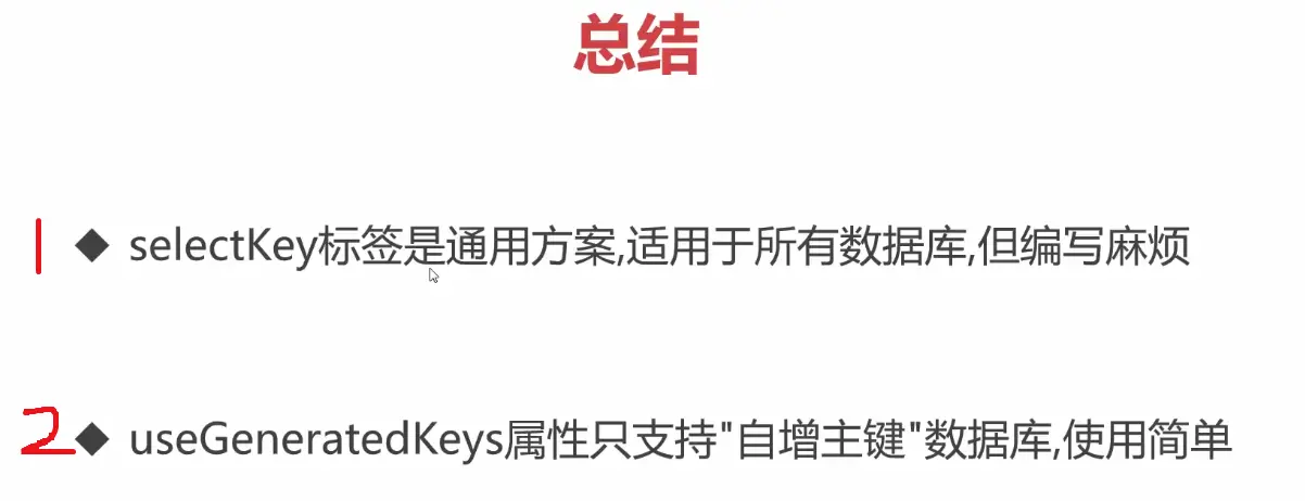 (3) 绝大多数可以使用【seGeneratedKeys属性】,因为其简单,适合初学者。。。优先推荐使用【seGeneratedKeys属性】;;;;;;;但是如果在复杂项目中,有很多种不同数据库要对数据进行支撑和保存的时候,就必须要使用【<selectKey>标签】了。