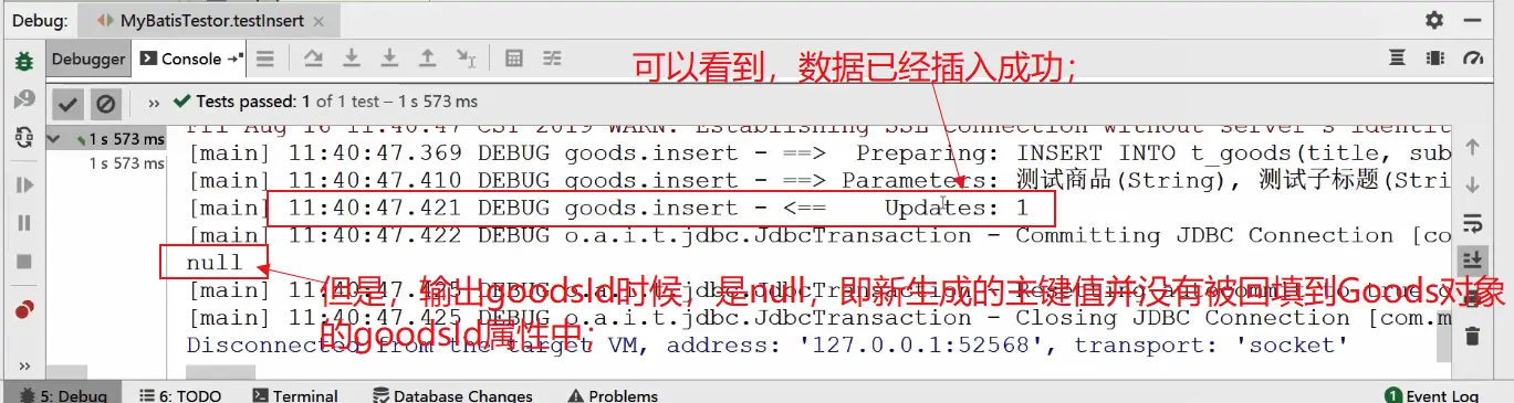 运行结果:新生成的主键值goods_id并没有被回填到Goods对象的goodsId属性中。