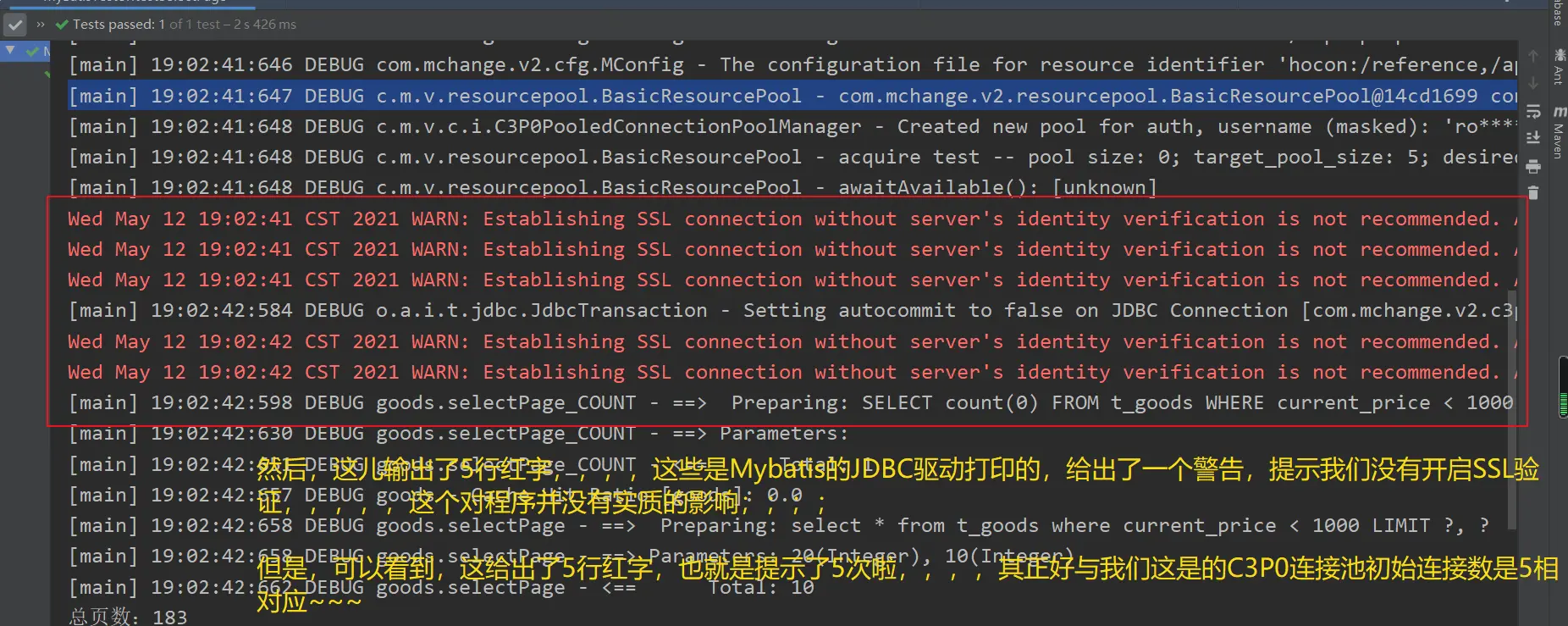 列出了初始化时的基本配置信息:start初始数量,min最小数量,max最大数量等;这些信息都是C3P0自动给我们输出的;