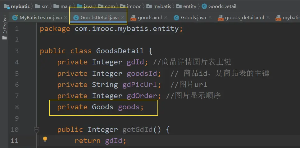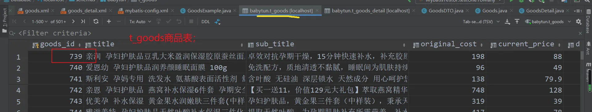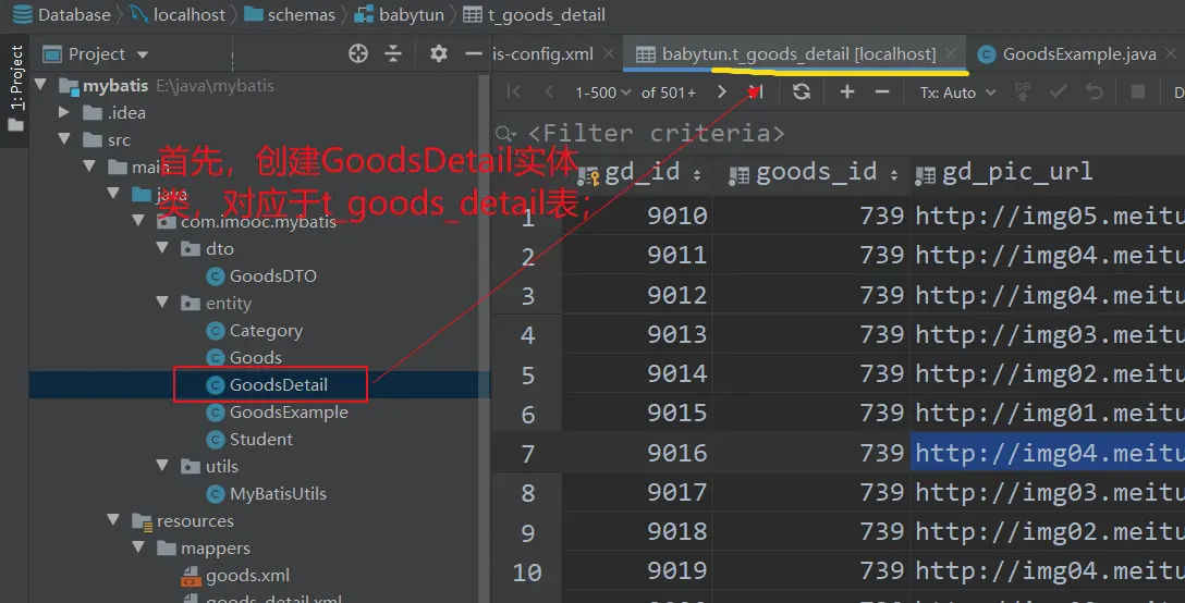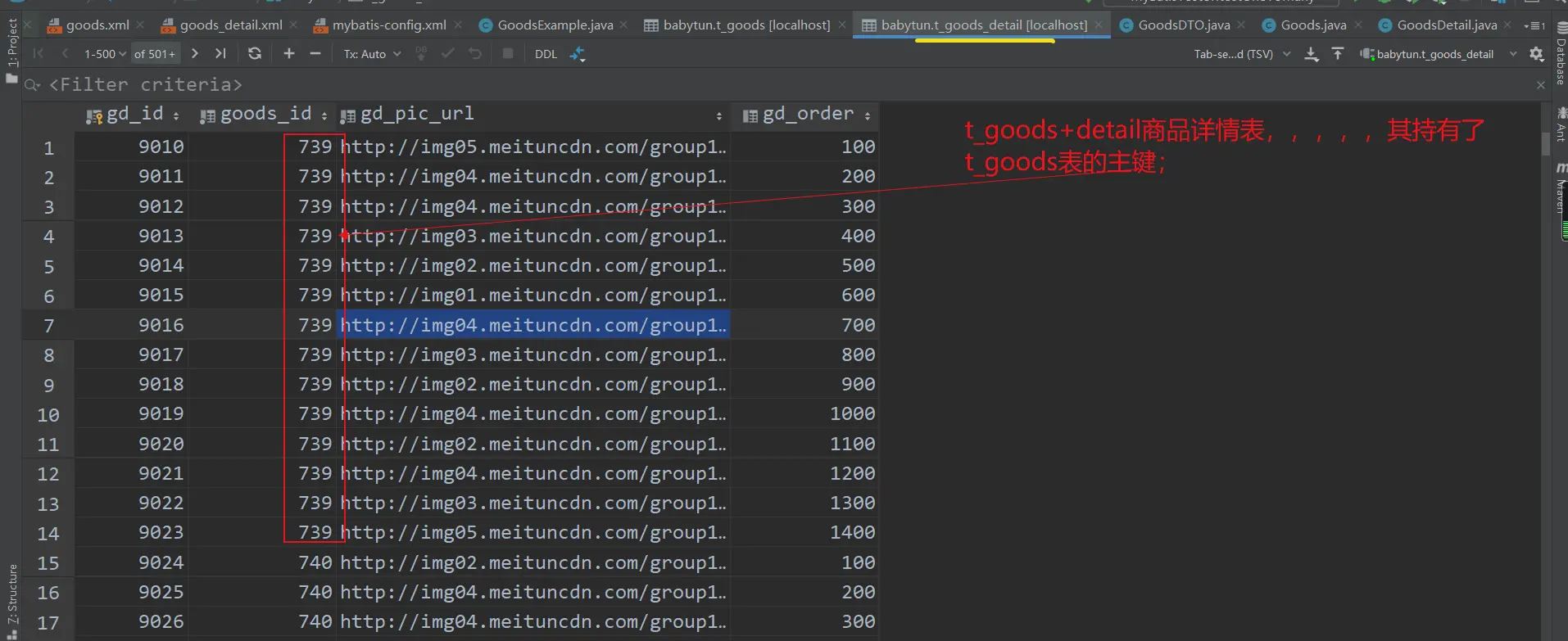 首先,因为涉及到t_goods_detail表,所以添加GoodsDetail类,添加goods_detail.xml