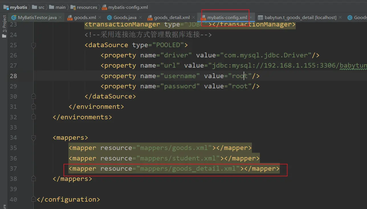 然后,要记得早mybatis-config.xml中配置一下goods_detail.xml;