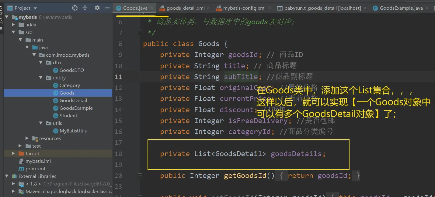 然后,在Goods类中,添加【List goodsDetails】→在对象层面上完成了Goods对象和GoodsDetail对象的关联